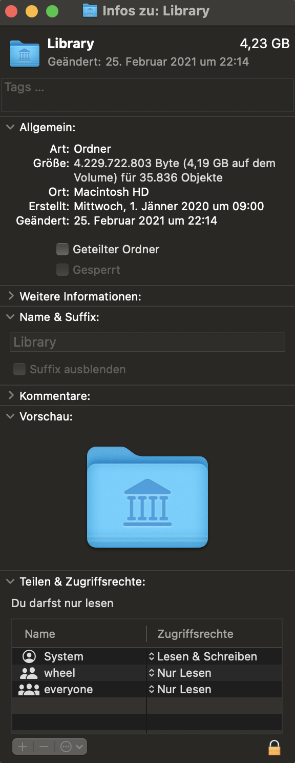 Darauf hin habe ich im ,,Finder" den Library Ordner aufgesucht, dort habe ich vollen Zugriff (ich ändere normal nichts im Library Ordner, außer Cookies und Caches.)