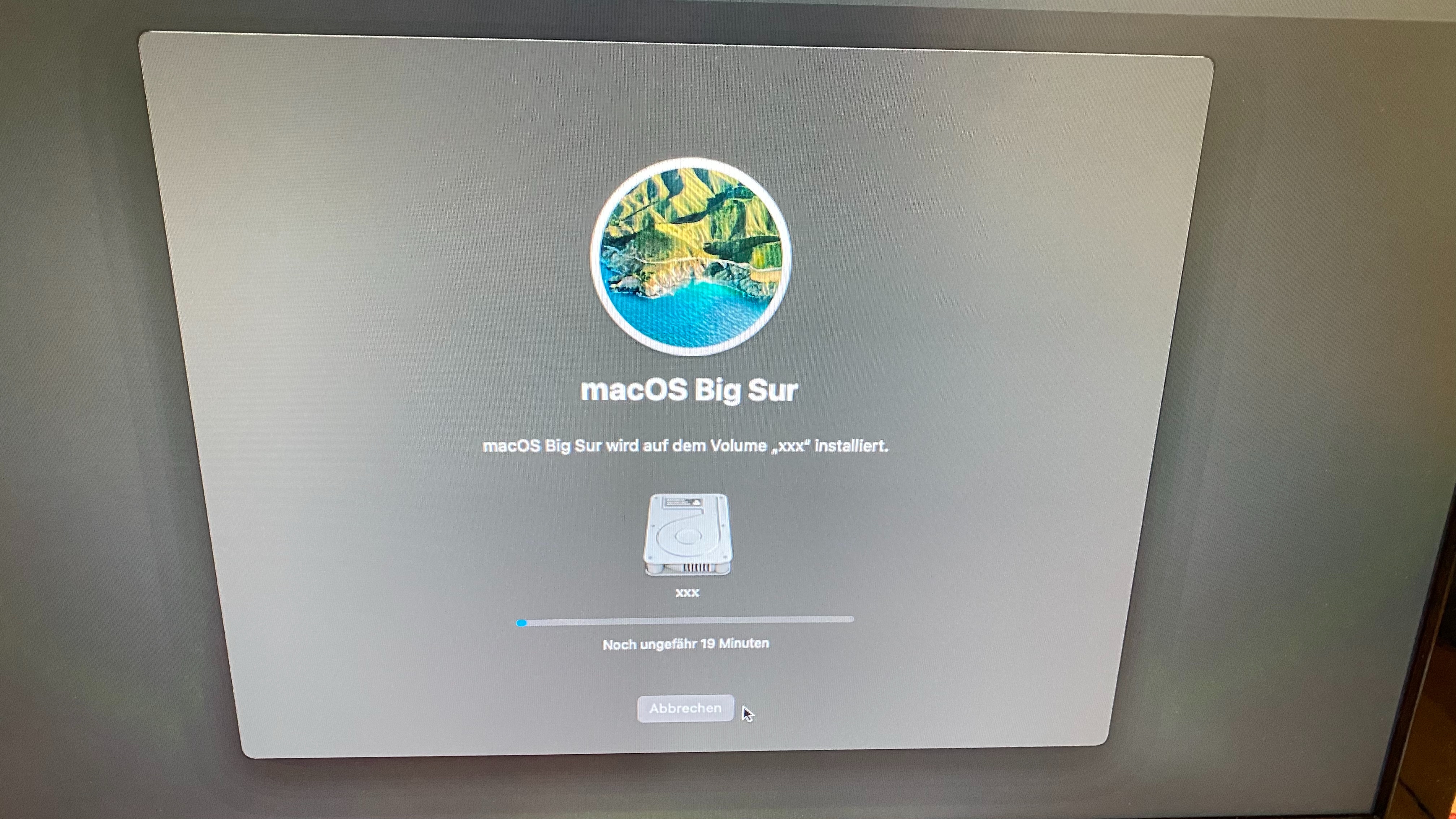 Nach ungefähr 40 Minuten reduziert sich die Zeit schlagartig auf 13 Minuten und läuft dann weiter ab. Nach weiteren drei Minuten kommt ein Ladekreis, dann startet das MacBook. Unter dem Apfel erscheint dann ein Ladebalken, unter dem "noch ca. 29 Minuten steht", dann bricht die Installation ab.