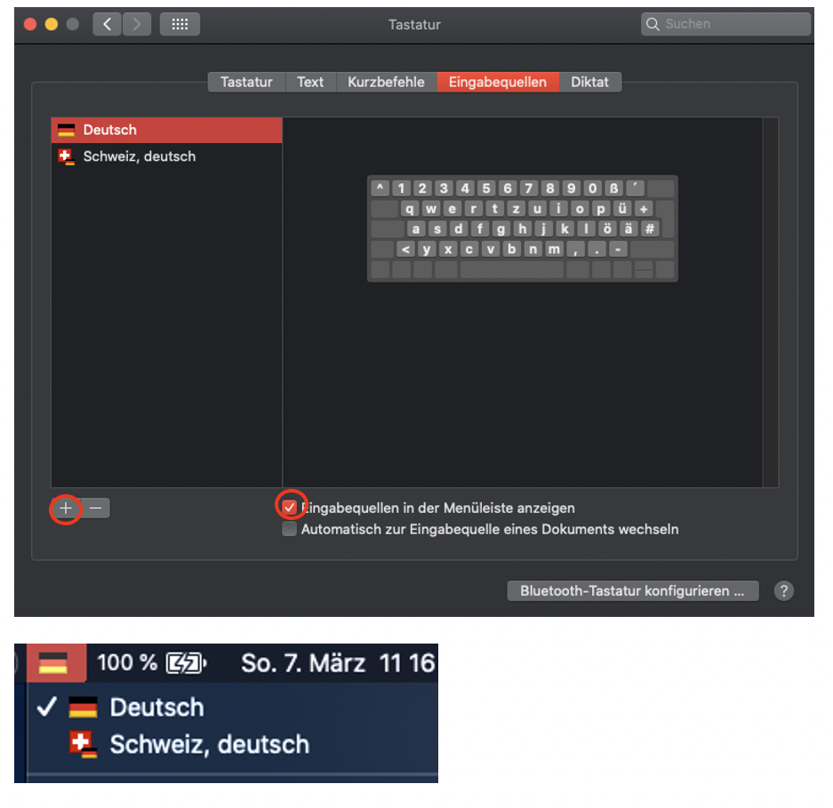 Apfel > Systemeinstellungen > Tastatur -> Eingabequellen: