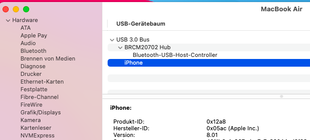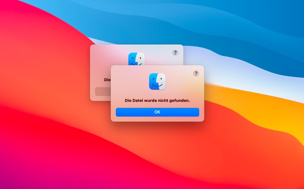 Ich schließe mein iPhone 6s (iOS 14.4) an mein MacBook Air (MacOS BigSur 11.1) an & sofort mit Vibration des iPhones erscheint 2x die Fehlermeldung "Die Datei wurde nicht gefunden" (siehe Bild). Mein iPhone erscheint nicht im Finder, im Systembericht aber schon. Backups, Updates und Co. sind so nicht möglich.