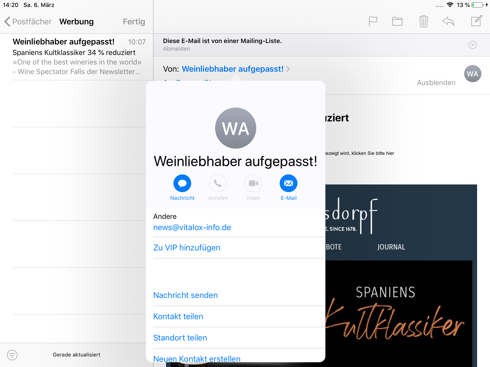Auf dem Iphone klappte alles wie beschrieben (in Einstellungen) und das Spamfach bleibt leer. Sollte eigentlich auch mit dem Ipad funktionieren, tut es aber nicht. Wenn ich auf die ankommende Mail drücke, erhalte ich die im Anhang zu sehende Möglichkeit, allerdings ohne die Option "Diesen Kontakt blockieren", wie auf dem Iphone.
