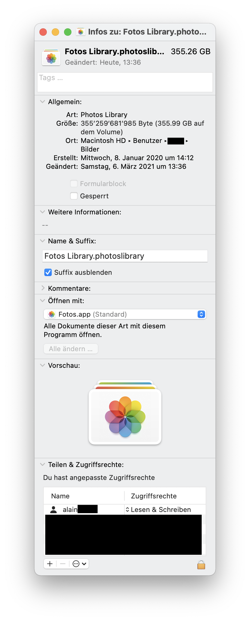 Mit einer einfachen Datei Feigabe funktioniert es nicht, weil Fotos.app einen Fehler anzeigt (im Anhang), obwohl die Library für mich freigegeben wäre (auch im Anhang).