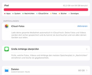 Ich habe ein iPad Air mit 64 GB Speicherplatz. Seit gestern Abend zeigt es mir jedoch ständig an, dass mein Speicherplatz voll ist (62,3 von 64 GB belegt).