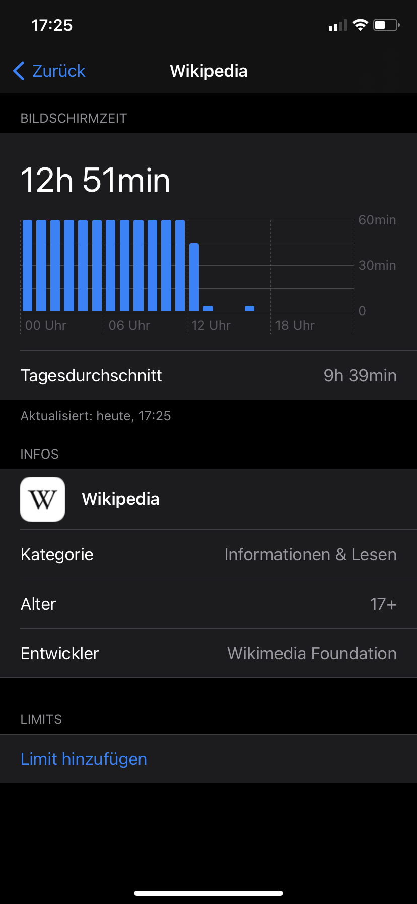 Seit neulich habe ich das Problem dass die Bildschirmzeit anzeigt dass ich 12h auf Wikipedia war obwohl ich es die ganze Nacht aus hatte, alle Tabs zu und auch alle Apps. Ausserdem war am Morgen alles ok und es zeigte es normal an. Ich hatte das Problem auch einmal mit Apps aber es ist meistens mit Websites. Mittlerweile bin ich sehr genervt davon, weil meine Eltern dann nämlich denken dass ich so viel am Handy bin und ich habe eh sehr wenig Zeit fürs Handy (Limits,Auszeit und wir reden hier nicht von grosszügigen z.b TikTok und Twitch:4 min Limit ,Youtube:5min, Snapchat:20min) Danke schonmal im Voraus liebe Community!
