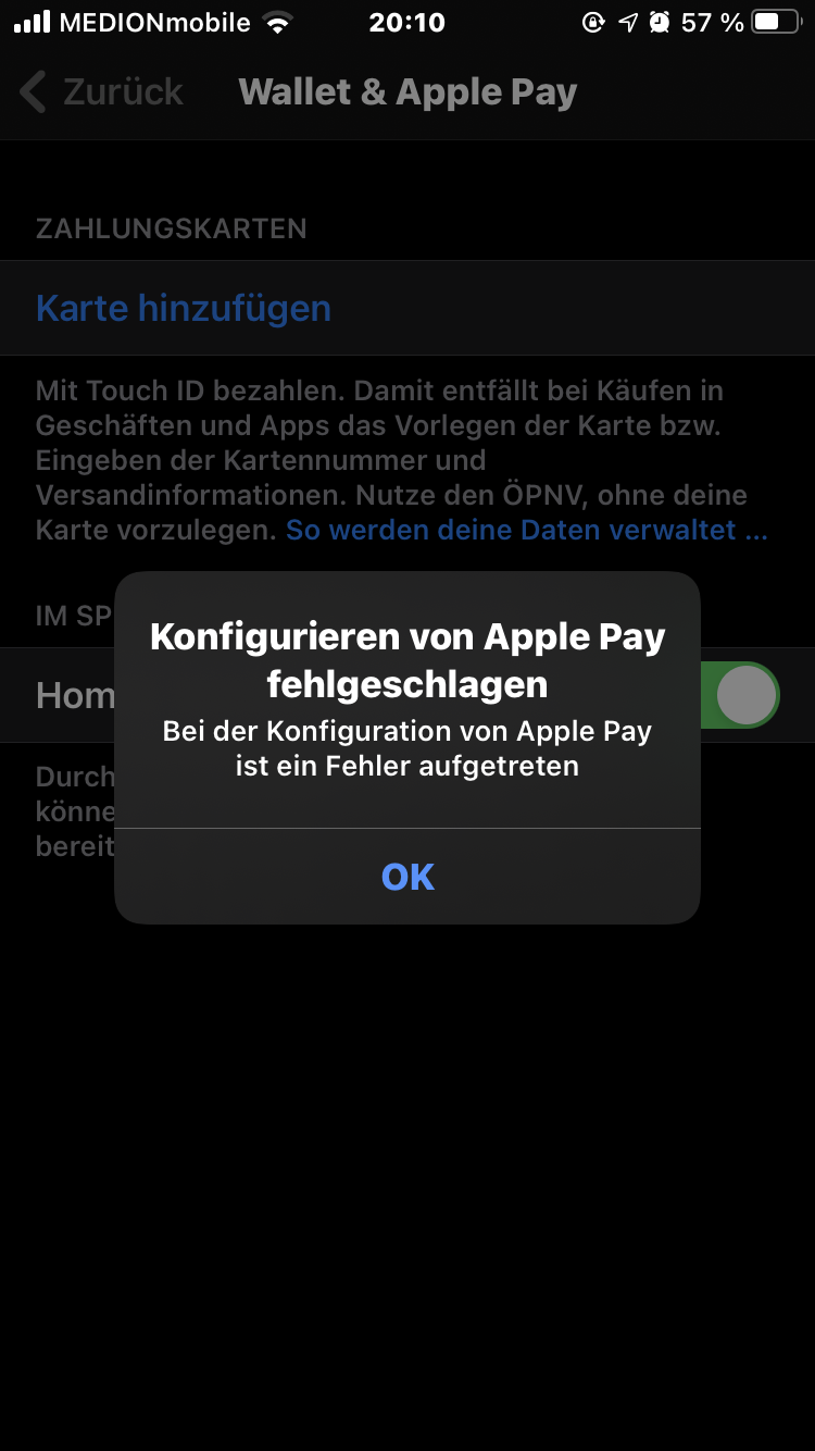 Wenn ich eine Karte hinzufügen möchte, kommt die Aussage, dass Die Konfiguration von Apple Pay fehlgeschlagen sei..meine Frage lautet Warum? Wieso? und was kann ich ändern damit es funktioniert..