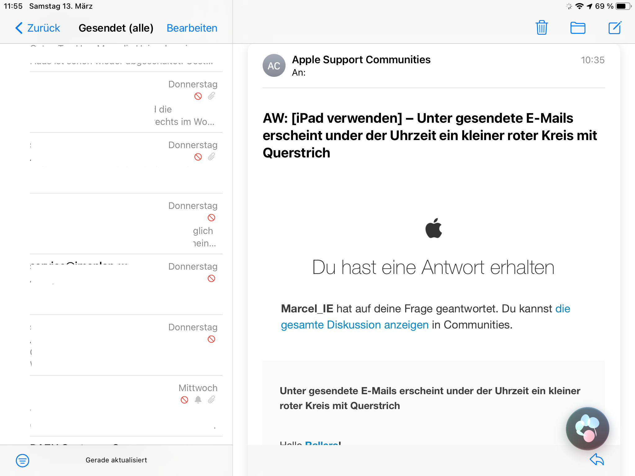 Auf meinem Ipad im Mail Account unter gesendete emails erscheint in den gesendeten e-mails unter der Uhrzeit ein kleiner roter Kreis mit Querstrich. Was hat das zu bedeuten? Danke für eure Hilfe