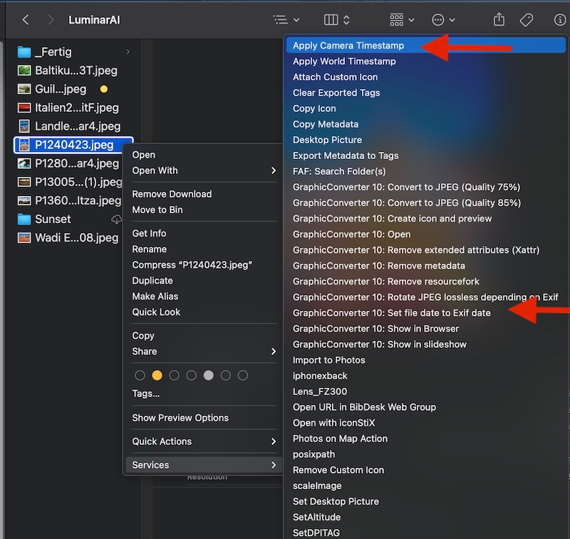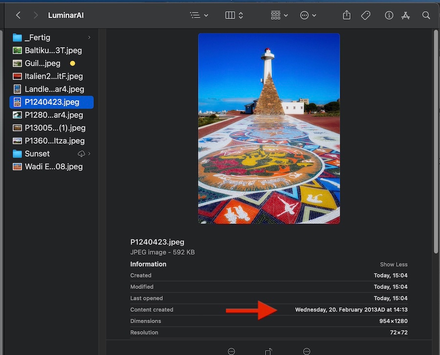 Die dort ausgewählten Optionen werden im Finder in den Vorschau-Infos für Bilder angezeigt. Das "Aufnahmedatum" entspricht der Option Inhalt erstellt.