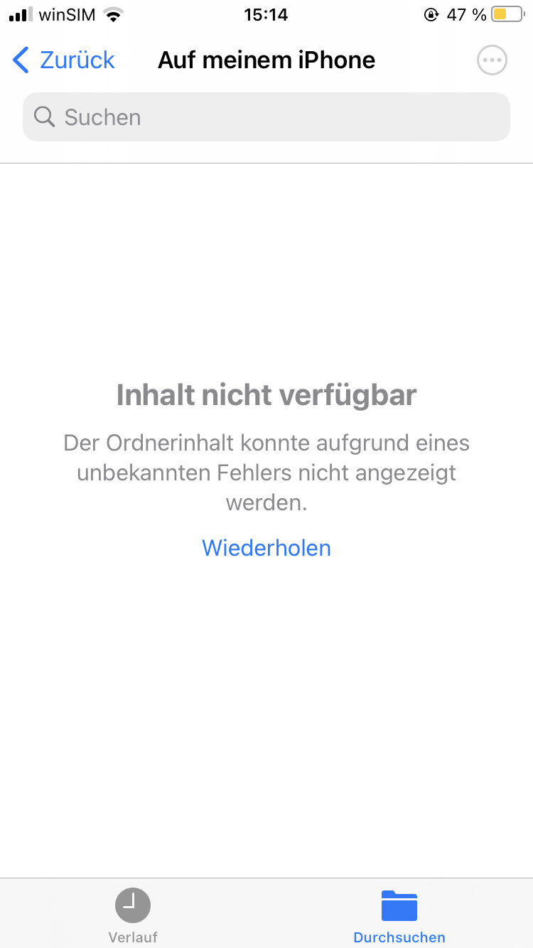 Auf der App Dateien, wollte ich unter dem Punkt „auf meinem iPhone“ auf meine Dateien zurück greifen. Daraufhin kam eine unbekannte Fehler Meldung