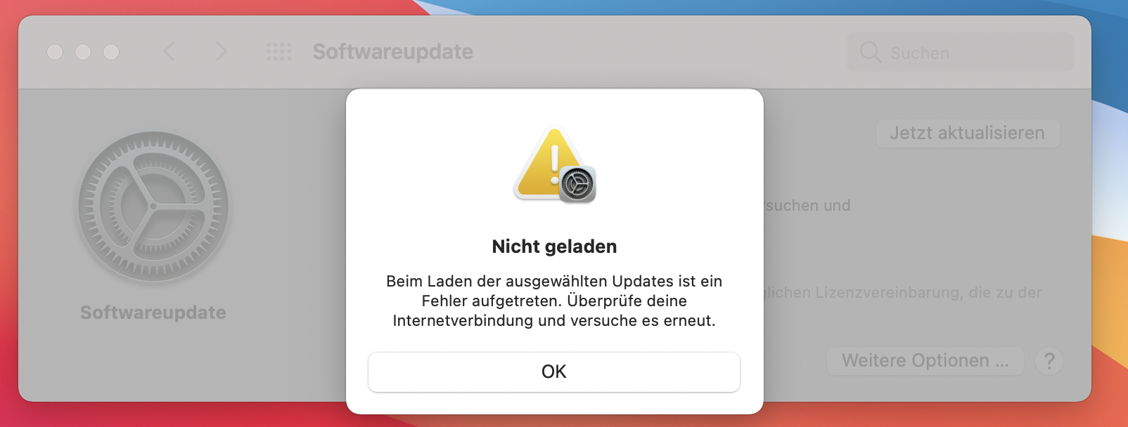 Wie kann ich das update 11.2.3 Big Sur erfolgreich durchführen, ohne Abbruchmeldung, dass beim Laden ein Fehler aufgetreten sei.