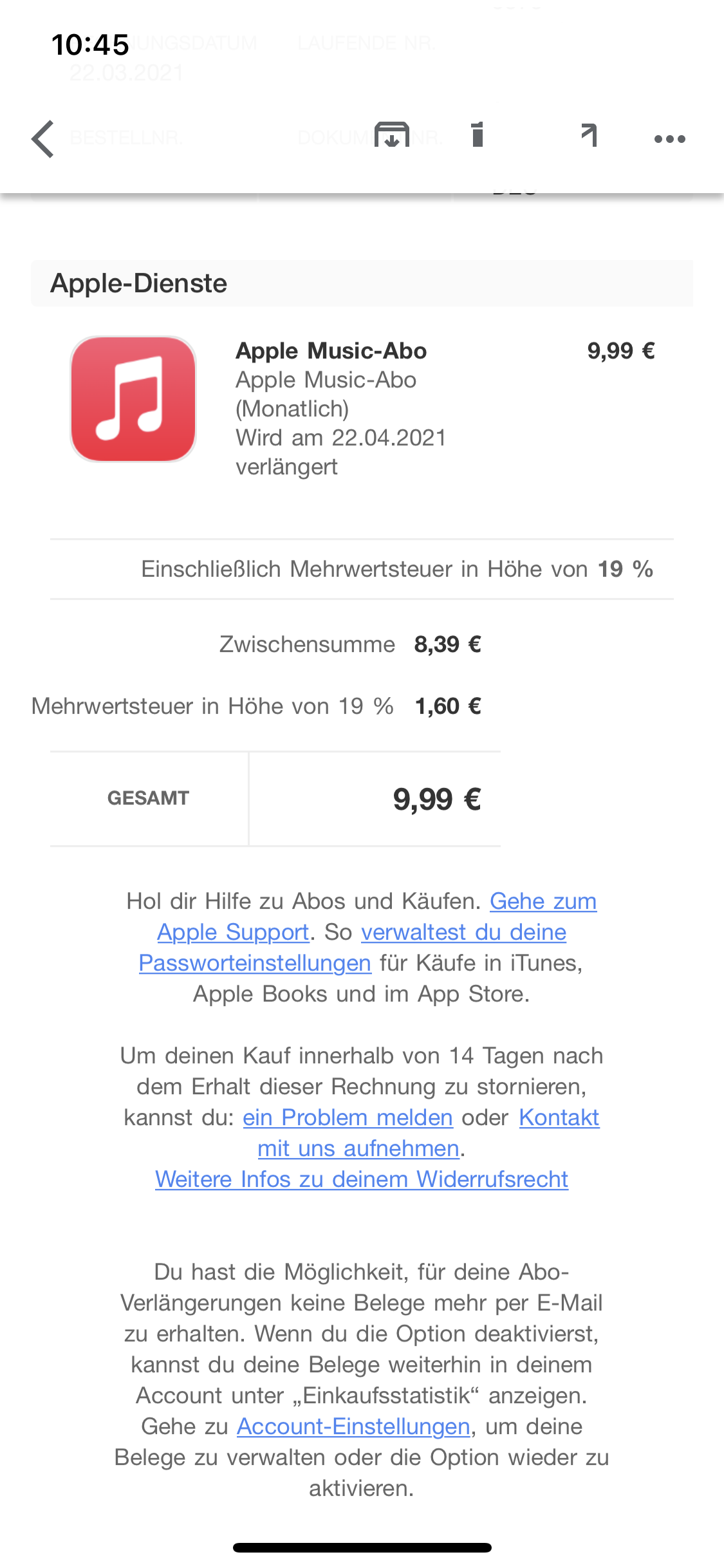 Ich kann Apple Musik App nicht stornieren,.Letzte Jede Monat versuche ich diese App storniert ,es sollte am 22.03 ablaufen.trotzdem bekomme ich weiterhin Rechnung und im Rechnung zeigt mir das wird am 22.04 verlängert obwohl ich storniere es jede Monat .Ein Verlängerungsbeleg ist aus .Helfen sie bitte.Ich bezahle 10 € pro Monat ,ich habe nie dies App benutzt.Es war ein Fehler.trotzdem kann ich nicht es stornieren.