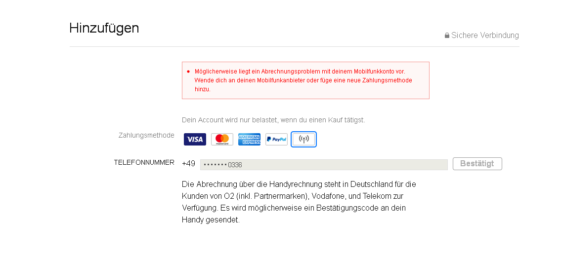 Ich möchte den Speicher auf 200 gb erhöhen. Ich kann jedoch keine Zahlung per Paypal oder Telefon einrichten. Ich erhalte eine Fehlermeldung und Ablehnung. Aber ich kann nur mit diesen Methoden bezahlen, was zu tun ist.