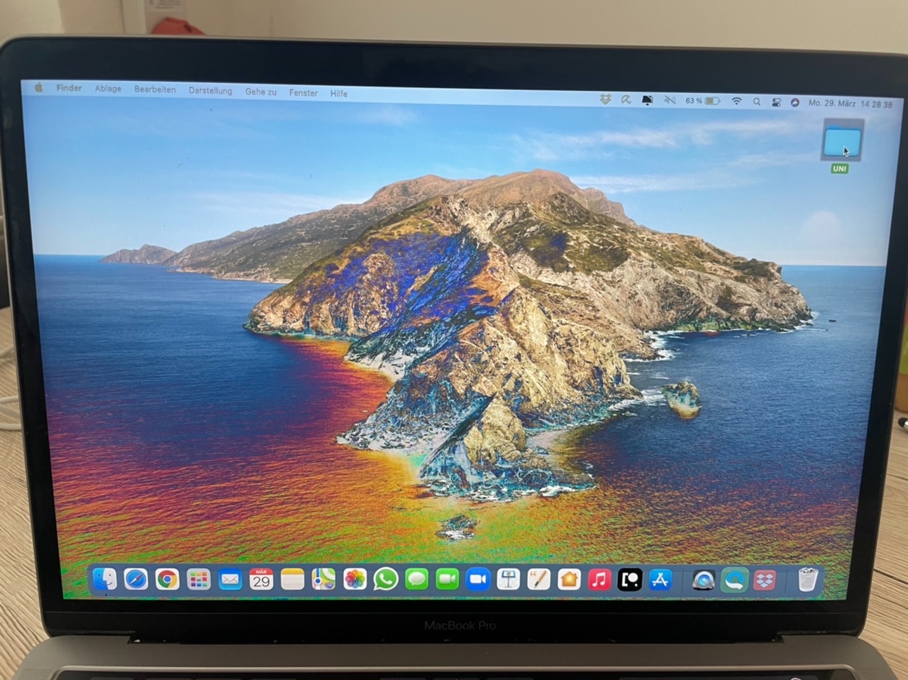 ich habe ein Macbook Pro 13“ 2019 mit TouchBar und war immer sehr zufrieden. Heute morgen habe ich das Gerät benutzt und alles war ganz normal. Als ich es vorhin wieder benutzen wollte, zeigte sich das Display plötzlich komplett Fehlerhaft(Farben falsch, Verpixelt->siehe Anhang). Allerdings tritt das nur auf, wenn das Display ,,normal“ aufgeklappt ist, wenn ich es halb schließe sieht alles normal aus.