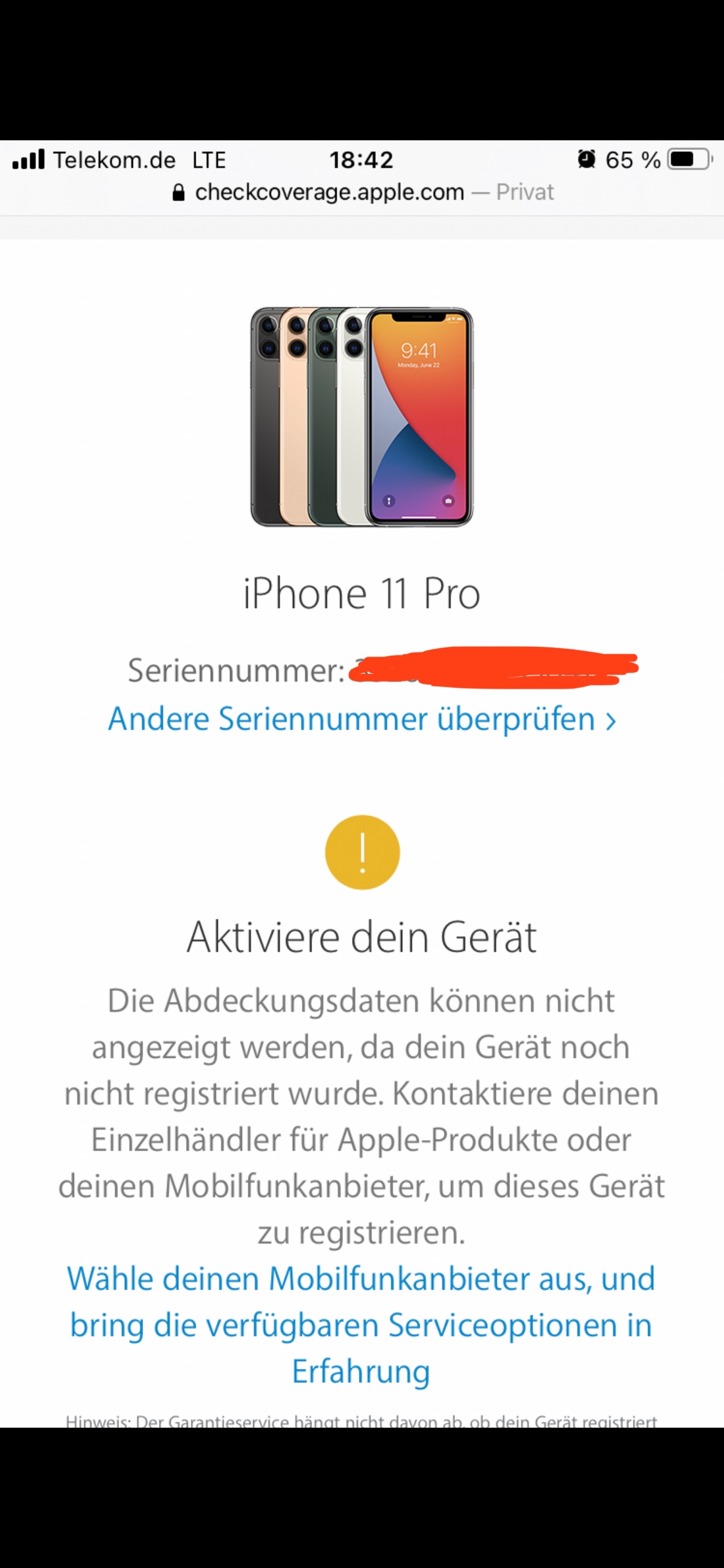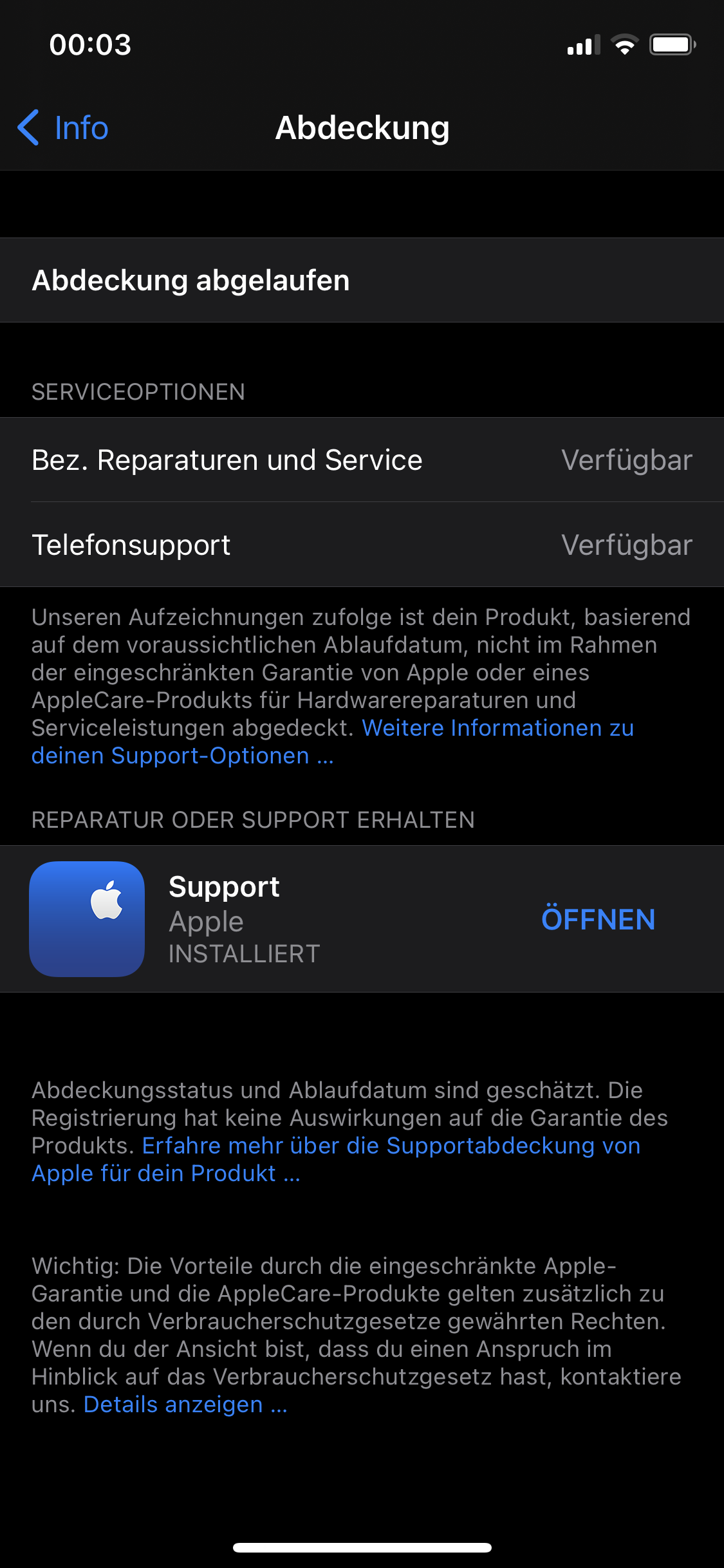 Nun stand aber unter Einstellungen/Info, die Abdeckung sei abgelaufen. Wenn ich heute die Garantieabfrage nochmal wiederhole, steht dort das Gleiche... 😕