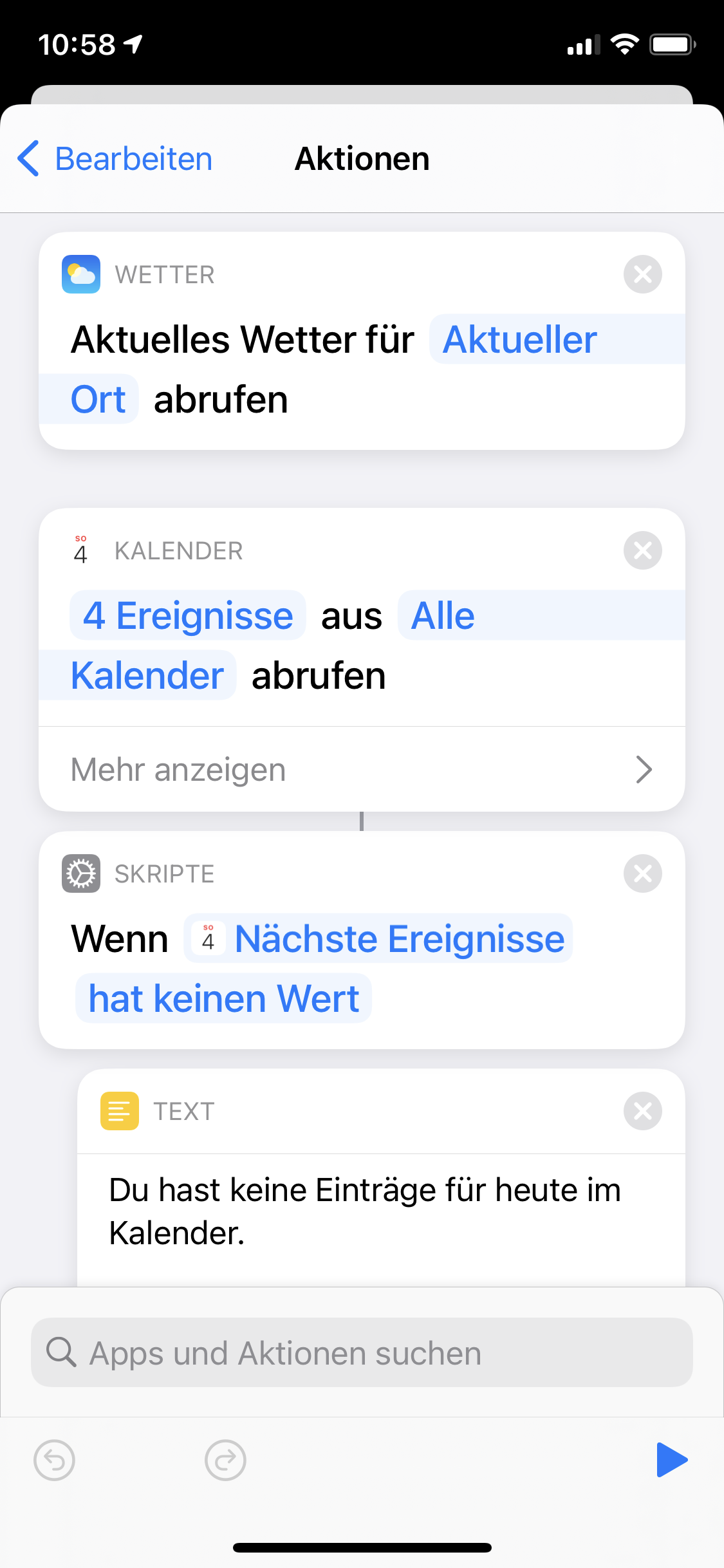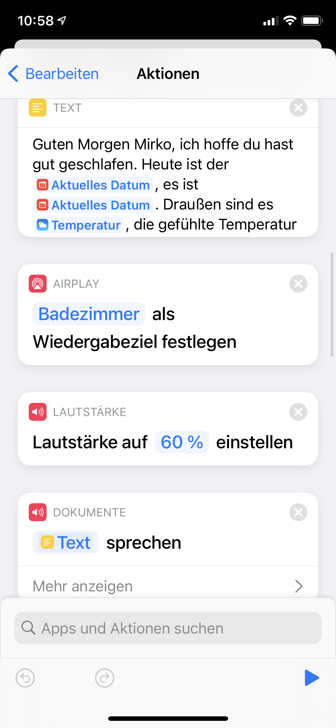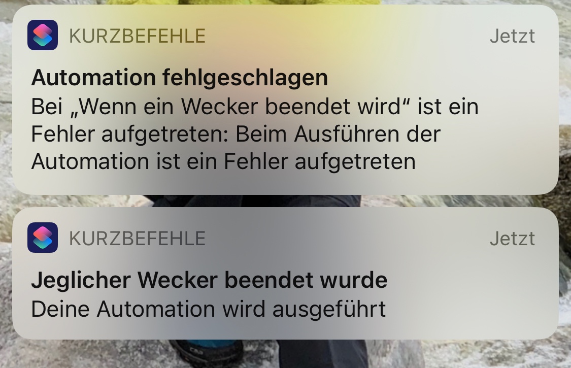 ich habe mir eine persönliche Automation erstellt in welcher mich nach dem Ausschalten des Weckers Siri auf meinem HomePod begrüßt, mir das aktuelle Datum und Uhrzeit, Wetterdaten und meine Termine ansagt und anschließend Radio abspielt. All dies habe ich erfolgreich eingefügt und probiert. Es funktioniert alles so wie es soll. Nun habe ich als Trigger das beenden des Weckers eingestellt und die Automation soll ohne zusätzliche Bestätigung starten. Dabei passiert folgendes, die Automation wird gestartet und dann auch wieder beendet, da ein Fehler aufgetreten ist. Leider verrät mir iOS nicht bei welchem Schritt oder wo das Problem war. Bin echt langsam am verzweifeln, da ich keine Ahnung habe wo ich ansetzen soll. Wahrscheinlich hängt es an den Wetterdaten in Zusammenhang mit den Standortdaten obwohl ich in den Datenschutzeinstellungen alles freigegeben habe. Leider kann ich nicht „Immer erlauben“ eingeben da dies nicht vorgegeben wird sondern nur beim „Verwenden der App/Widget“. Ich füge mal die Kurzbefehle an. Vielleicht findet ja jemand das Problem.