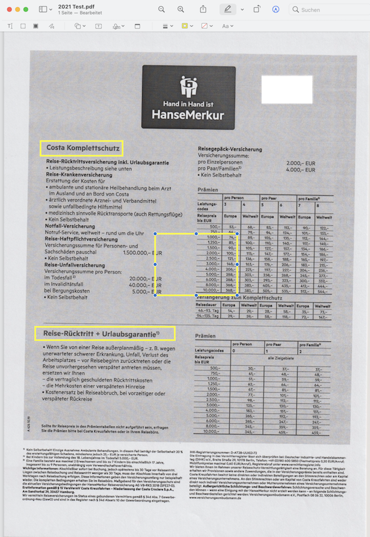 Wenn ich den Markierstift auswähle und versuche zu markieren, ist dies nicht möglich. Lediglich die ganze Seite färbt sich während des Tastendrucks kurz. Mit Acrobat Reader habe ich das Problem nicht. Öffne ich die durch Acrobat Reader bearbeitete Datei mit Vorschau, dann zeigt dies die markierten Buchstaben nicht mehr an, sondern nur einen farbigen Balken.