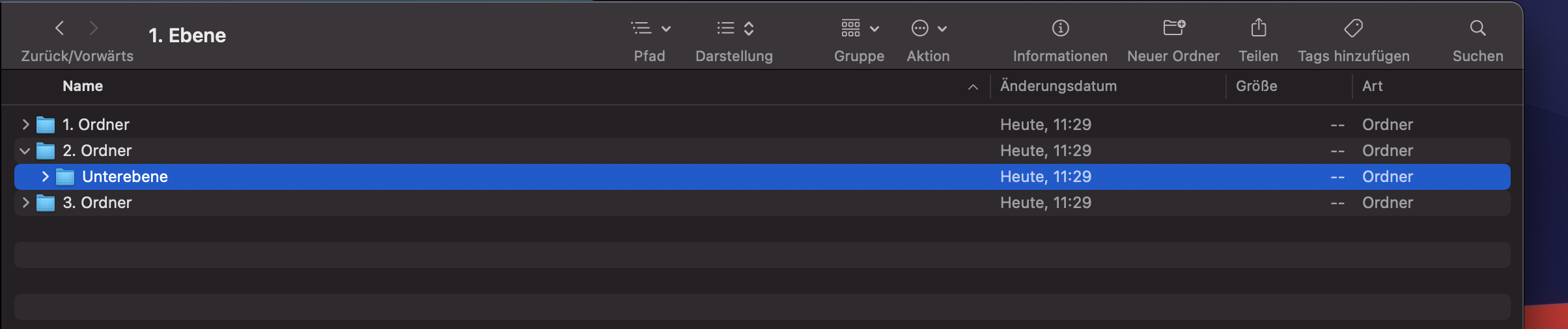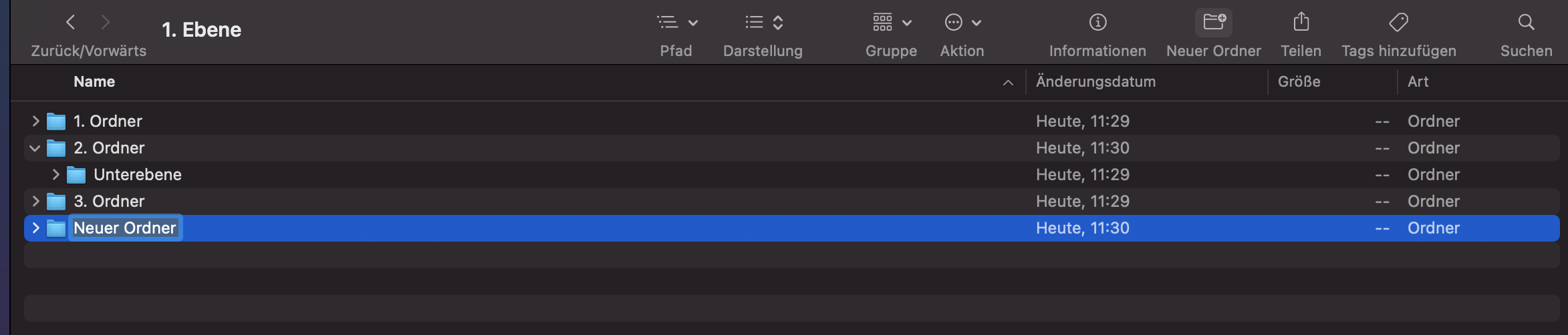 Wenn ich im Finder in einem Unterordner einen weiteren Ordner erstellen will gehe ich auf jenen Unterordner und erzeuge dann durch "Aktion -> erstellen eines Ordner" dann einen neuen Ordner.