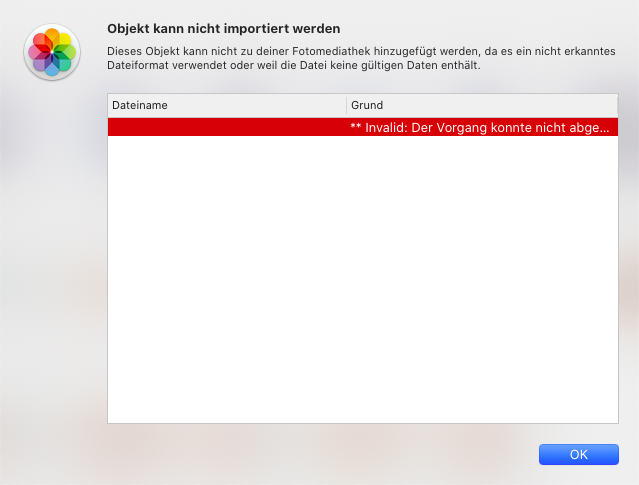 seit gestern bekomme ich immer wieder die selbe Fehlermeldung, sobald ich ein Bild in Fotos einfügen möchte. Dabei ist es egal, ob das Bild von einer Speicherkarte, von meinem iPhone, von der Festplatte oder direkt aus einer Datei vom Mac kommt. Es handelt sich hierbei um Bilder des Typs jpeg. Erst klappte es nach mehrmaligen Versuchen, nun geht aber gar nichts mehr.