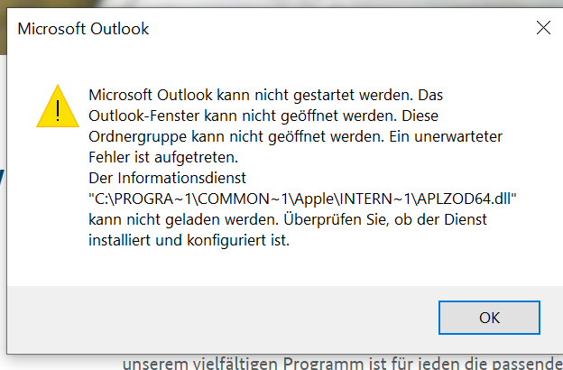 Ich habe Microsoft 365 installiert, und kann Outlook nicht mehr öffnen. Als Fehlermeldung erhalte ich:
