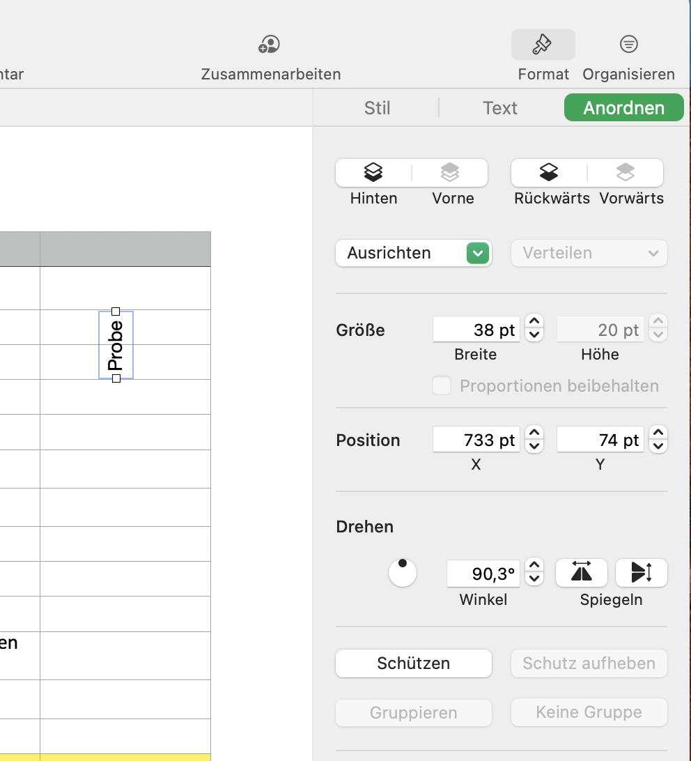 Ich möchte in Numbers in einer Zelle vertikalen Text haben, doch wie hier in der Hilfe beschrieben gibt es unter dem Reiter Format - Text die Vorgabe vertikaler Text nicht. Könnt Ihr mir helfen