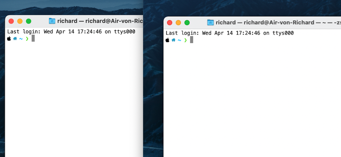 Links Darstellung des Terminals auf dem MacBook Bildschirm, rechts auf dem externen Monitor: