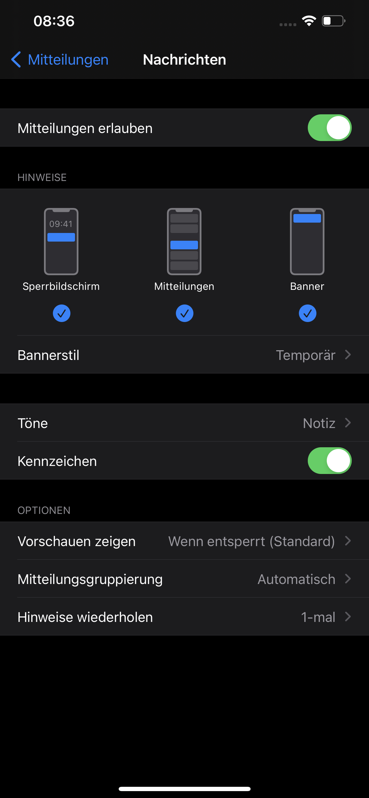 Ansonsten überprüfe bitte die Mitteilungen zu Nachrichten: Ändern der Mitteilungen zu Nachrichten auf dem iPhone. Ich habe einmal eine Bildschirmaufnahme von meinen Einstellungen dazu gemacht:
