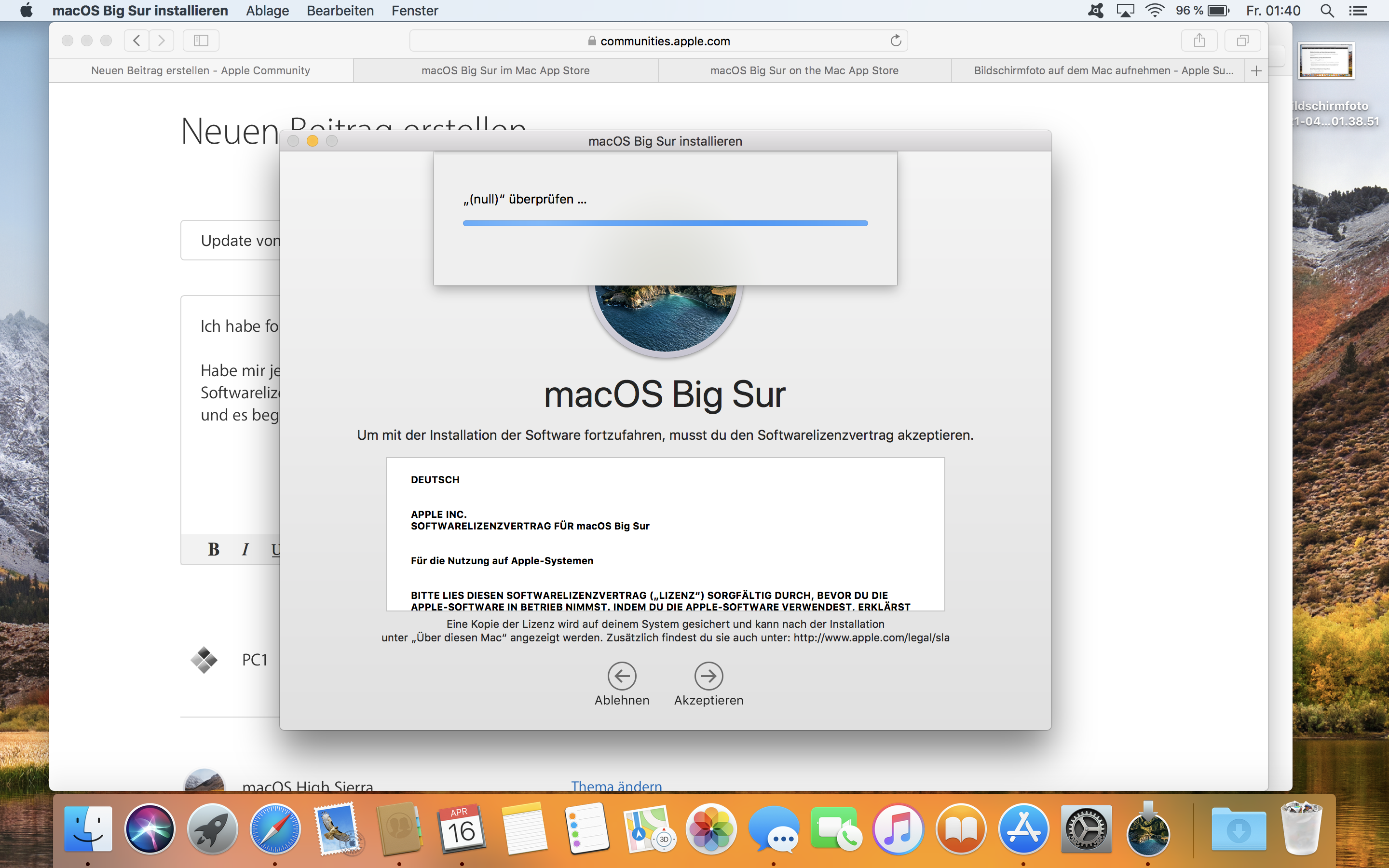 Habe mir jetzt Big Sur von der offiziellen Seite heruntergeladen. Sobald ich auf öffnen klicke muss ich den Softwarelizenzvertrag zustimmen, sobald ich das gemacht habe kommt folgende Meldung(siehe Foto) und es beginnt nicht mit dem Update. Es steht dann eben nur "(null)" überprüfen und die Leiste ist voll geladen, aber fährt nicht mit dem Update fort.