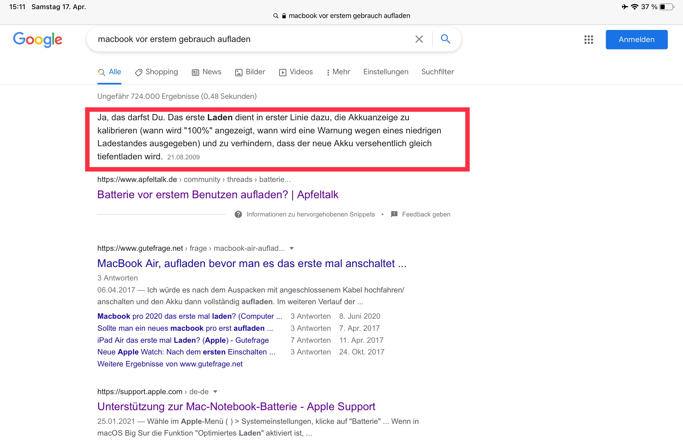 Ich habe in die Suchmaschine „macbook vor erstem gebrauch aufladen“ eingegeben, ob der Eintrag aus 2009 noch aktuell ist, das vermag ich nicht zu beurteilen...