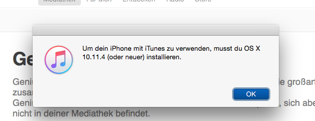 vielleicht kann jemand weiterhelfen? Ich musste mein iphone SE löschen und neu installieren. Es wurde dabei ein Update auf iOS 14.4.2 gemacht. Vorher hatte ich auch schon iOS 14.4. auf dem Handy. Nach der Neuinstallation des iphone kann ich es aber plötzlich nicht mehr mit meinem Mac, Baujahr 2009, Yosemite, verbinden. Itunes 12.8.1.3 ist das letzte Update, was ich mit dem Mac machen konnte. Bisher hatte ich keine Verbindungsprobleme, obwohl das iPhone schon iOS 14.4 hatte. Nun erhalte ich beim Verbindungsversuch von itunes die Meldung, dass ich das Betriebssystem auf 10.11 oder höher installieren soll. Das geht aber auf meinem alten Gerät nicht mehr. Gibt es irgendeine Möglichkeit, mein iphone wieder mit dem Mac zu verbinden? Denn vorher klappte es ja auch....