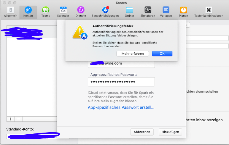 Wie bereits gesagt, das Ganze hat bis heute Mittag einwandfrei funktioniert und nie Schwierigkeiten gemacht. Ich wurde auch nie bis heute gebeten mich in Spark mit der app-spezifischen-Authentifizierung für meinen iCloud-Account einzuloggen. Ich habe auch in den letzten Tagen keine neu Software installiert, keine Updates durchgeführt (zumindest nicht heute) und sonst keine außergewöhnliche Aktionen vorgenommen. Einfach nur ganz normal am Mac gearbeitet.
