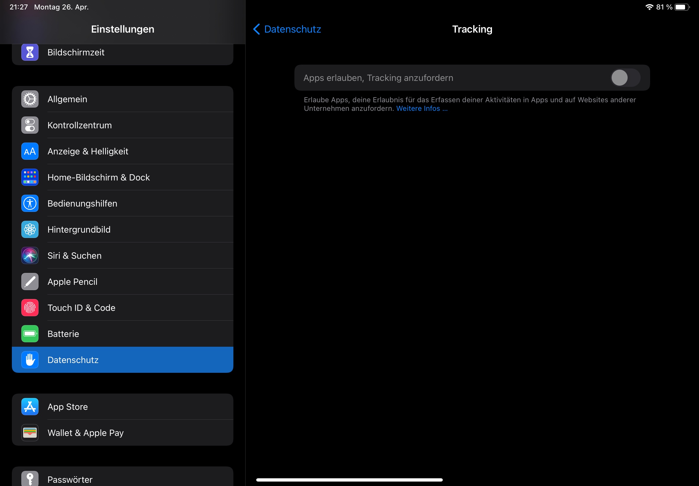 Ich kann die Tracking Option (Datenschutz > Tracking > Apps erlauben, Tracking anzufordern) nicht umschalten. Es geht aber, wenn ich mich von meiner Medien & Käufe in meiner Apple ID auf "aus" stelle. Neustart, Einstellungen zurücksetzen haben auch auch nicht geholfen. Wie kann ich denn ich denn dieses Problem beheben?