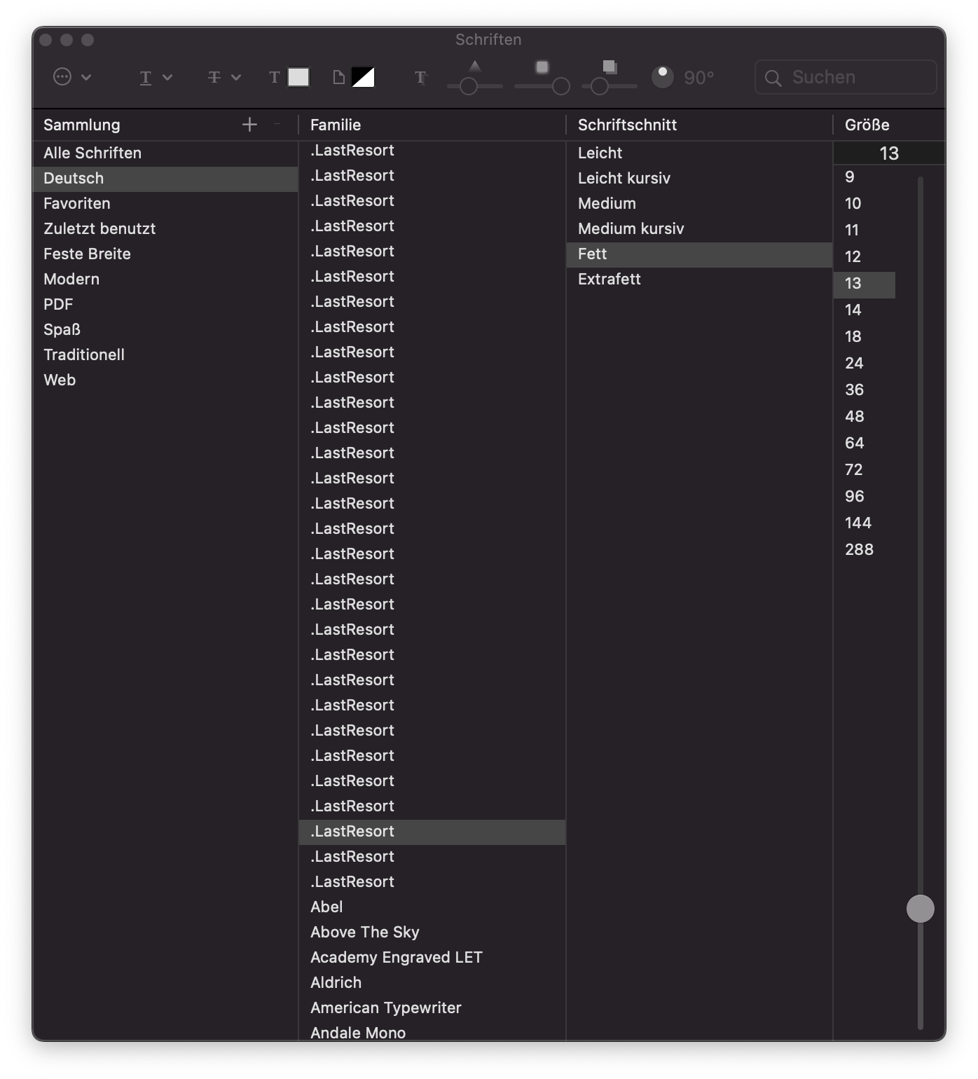 Ich habe Seite einiger Zeit in meiner Systemschriftenpalette (wie man sie in Mail oder Notizen öffnet) ca. 40 - 50 gleichlautende Einträge dem Namen „.LastResort". Wähle ich eine dieser „Schriften" aus, liegt in diesem Ordner meist 1 Schriftschnitt „Regular" aber auch mal 4 Schnitte der Frutiger oder ähnliches.