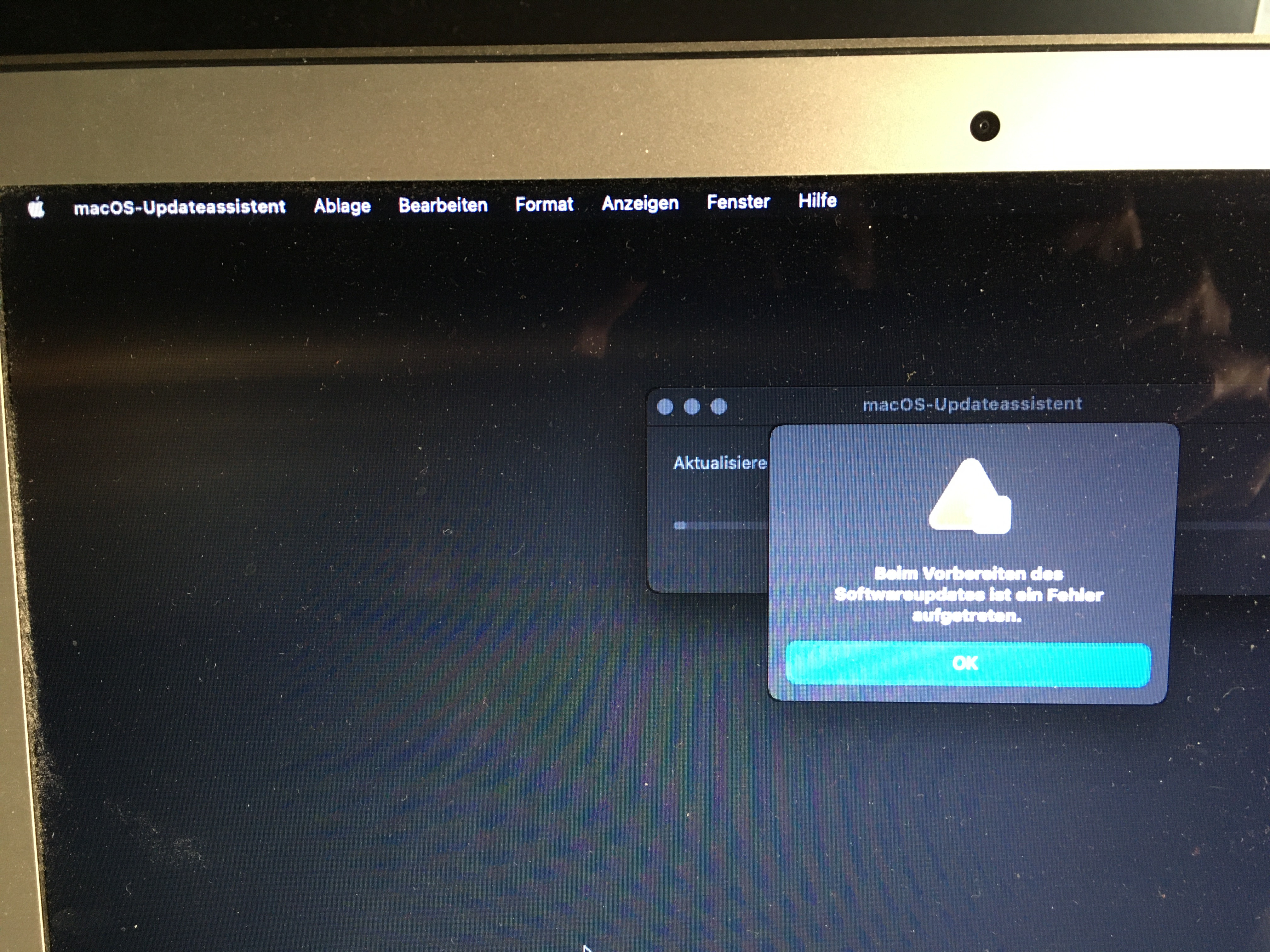 Es kam ein Fehler vom macOS-Updateassistent: "Beim Vorbereiten des Softwareupdates ist ein Fehler aufgetreten."