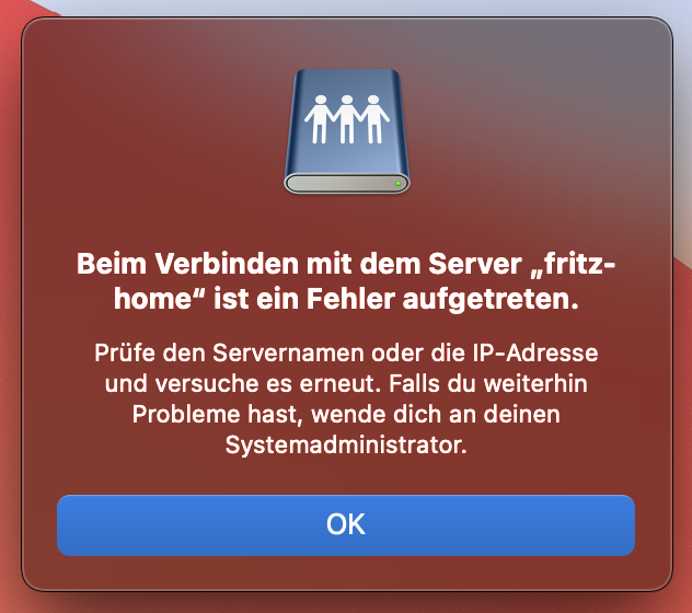 Beim Versuch des Verbindungsaufbaus durch den iMac über gehe zu/mit Server verbinden kommt folgende Fehlermeldung (ich bin eigentlich selbst Admin, Servername und IP-Adresse stimmen):