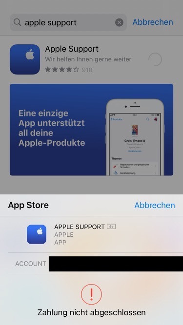 Zahlung nicht abgeschlossen – App Store beim Download kostenloser Apps