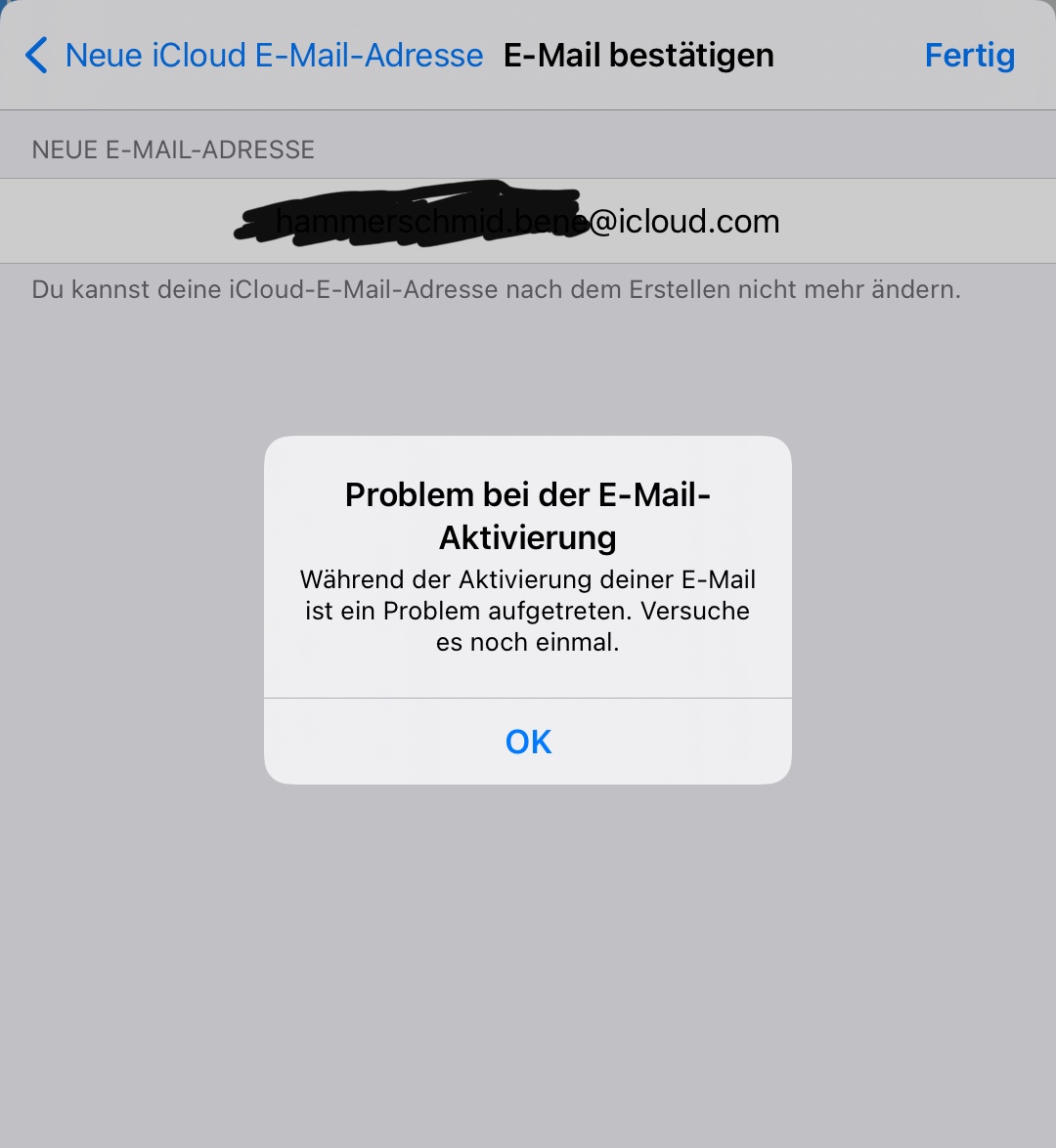 ich wollte meine E Mails jetzt auf das spezifische Apple Programm einrichten. Zudem wollte ich logischerweise Mail in iCloud erlauben. Jedoch muss mann hierfür eine iCloud Mailadresse erstellen. Aber bei der Erstellung erhalte ich eine Fehlermeldung.