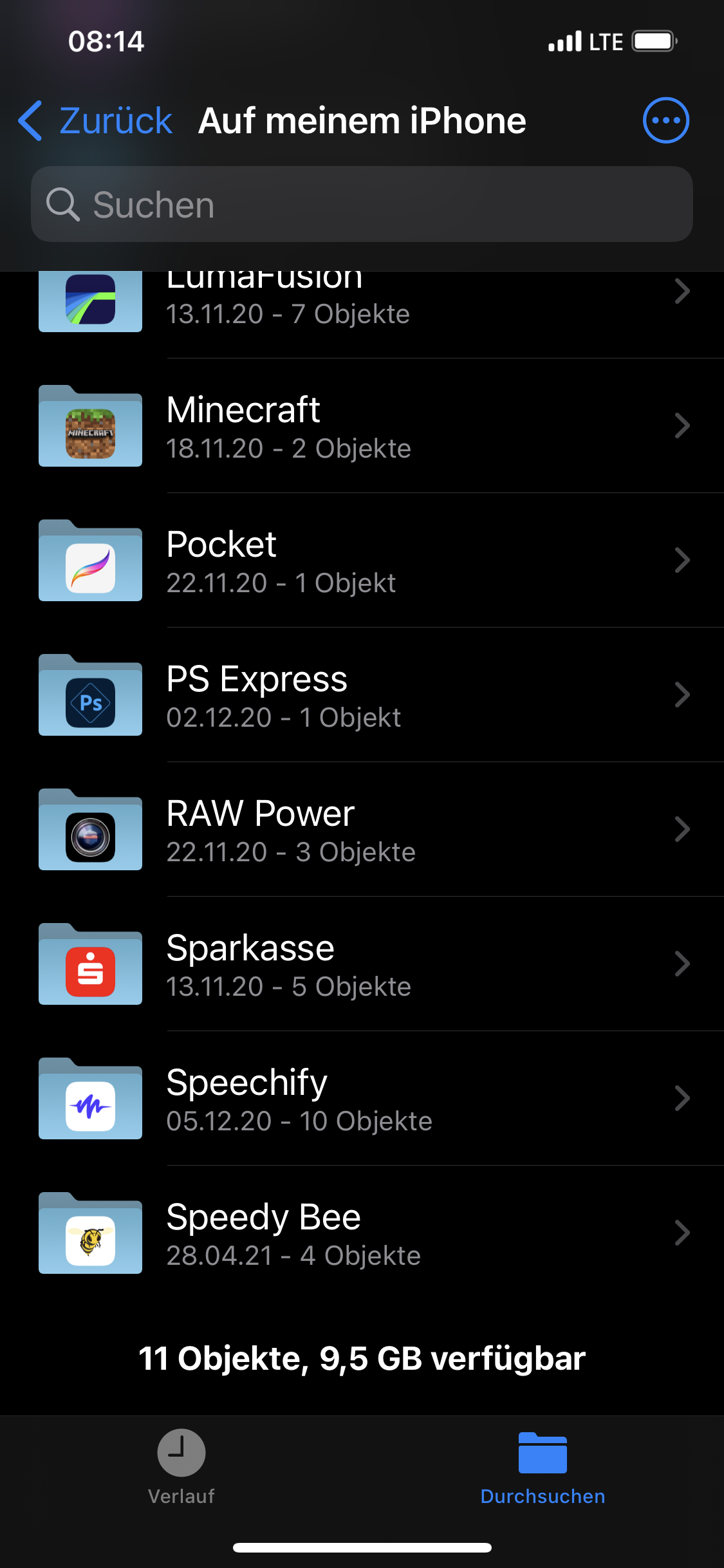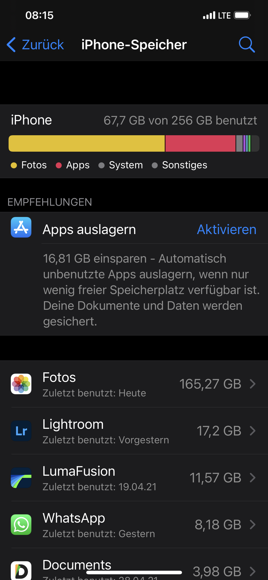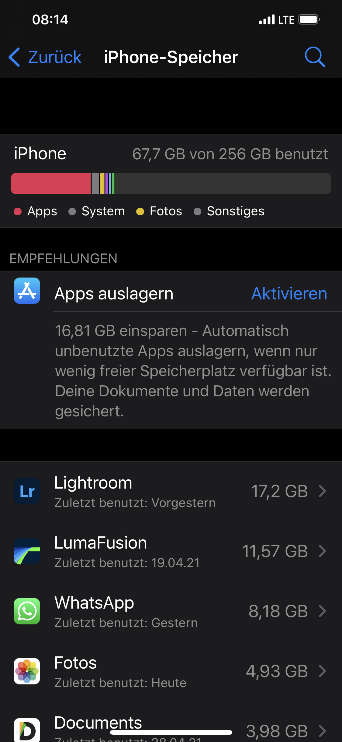 Die Dateien App zeigt an, dass ich nur noch ca. 9GB frei habe)