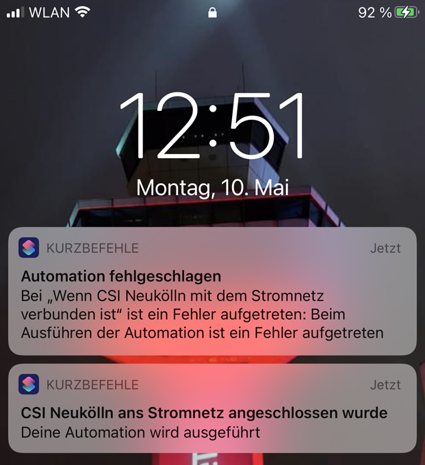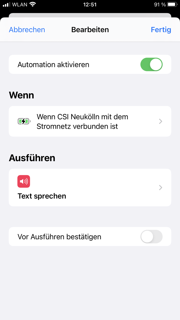 Ich habe die folgende Frage: beim Ausführen der Automation (Text lesen) bei Anschluss des iPhones an das Stromnetz per Ladekabel kommt die erste Meldung: "... Deine Automation wird ausgeführt." und danach direkt die zweite Meldung: "Automation fehlgeschlagen ... Beim Ausführen der Automation ist ein Fehler aufgetreten." Ich habe das iPhone 7 Plus mit IOS 14.5.1