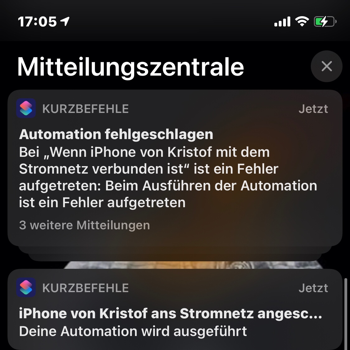 Ich habe die folgende Frage: beim Ausführen der Automation (Text lesen) bei Anschluss des iPhones an das Stromnetz per Ladekabel kommt die erste Meldung: "... Deine Automation wird ausgeführt." und danach direkt die zweite Meldung: "Automation fehlgeschlagen ... Beim Ausführen der Automation ist ein Fehler aufgetreten." Ich habe das iPhone 7 Plus mit IOS 14.5.1