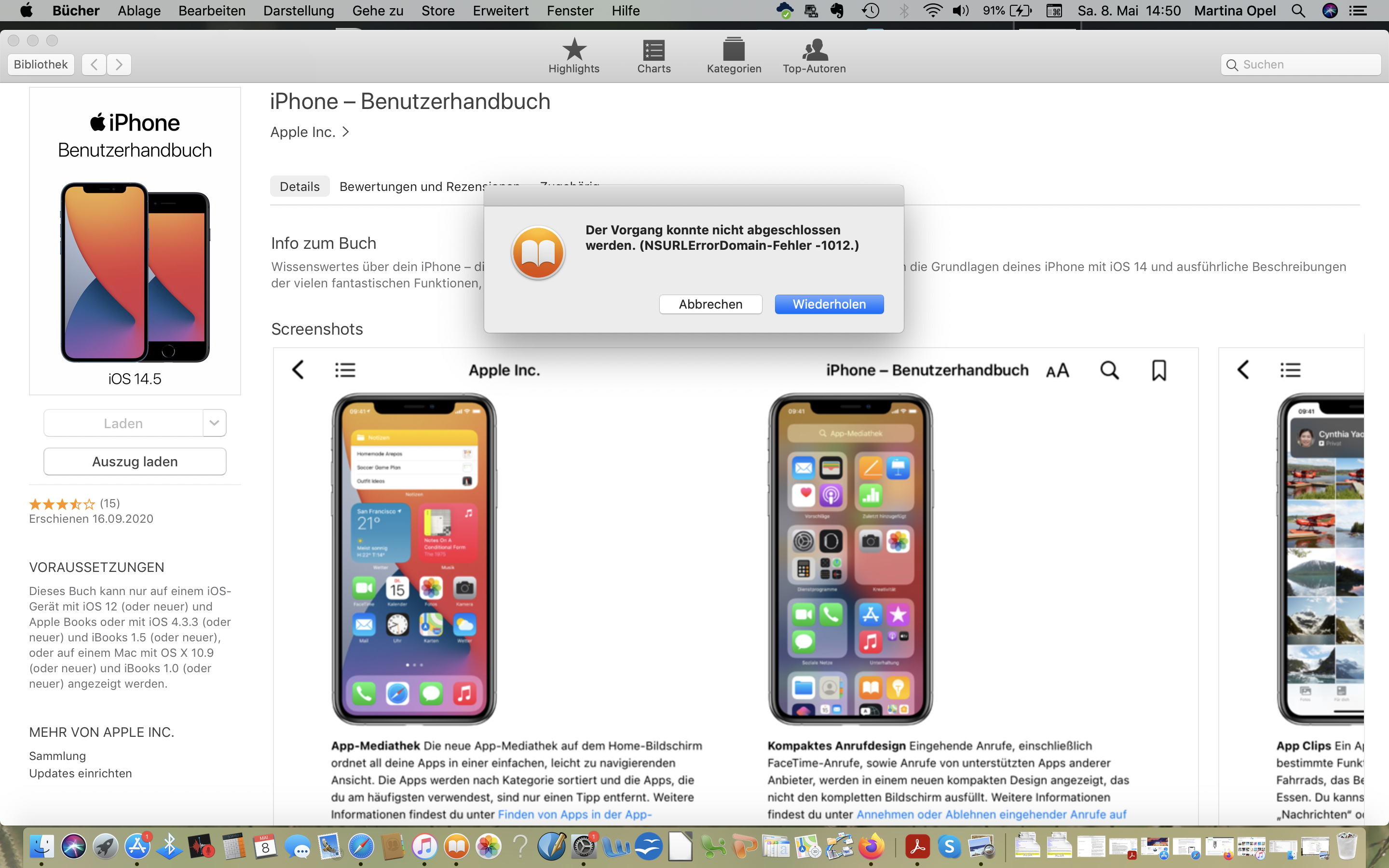 1.) was bedeutet es, wenn ich im iBook/BücherApp mit Version 1.19 (1645) beim Laden von einem kostenlosen Benutzerhandbuch(=für iPhone iOS 14.5) folgende Meldung bekomme: "Der Vorgang konnte nicht abgeschlossen werden. (NSURLErrorDomain-Fehler -1012." ?