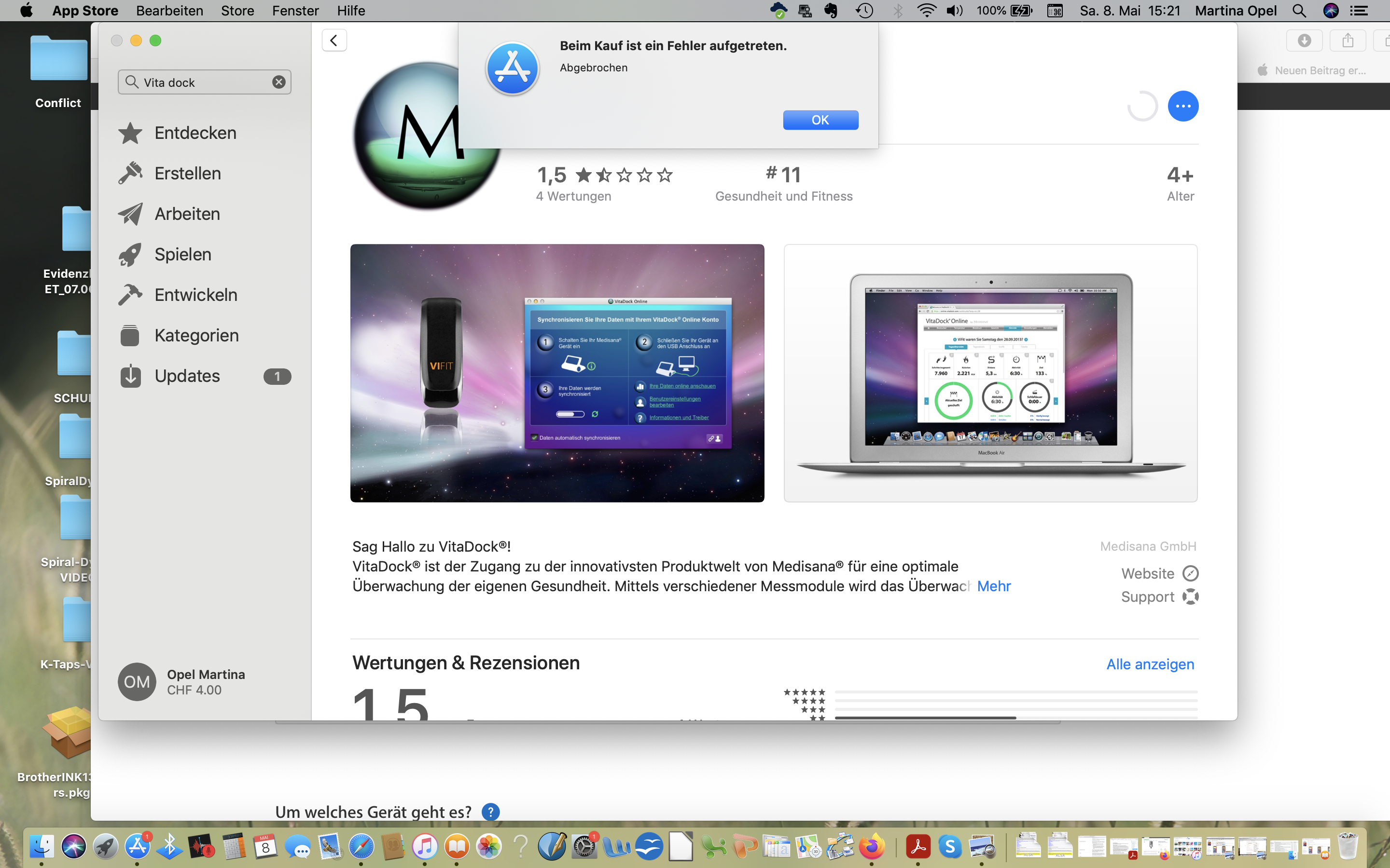 2.) Ausserdem kann ich auch im AppStore die kostenfreie App/Software von "VitaDock®" von Medisana nicht herunterladen. Es ist ein Programm/App um z.B. Messdaten von einem Blutzuckermessgerät mit dem Mac zu synchronisieren. Nach dem Drücken von Laden/Installieren kommt das Feld "Beim Kauf ist ein Fehler aufgetreten. Abgebrochen".