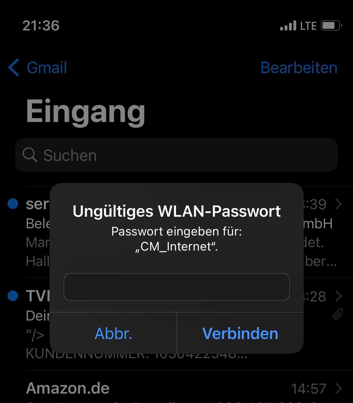 Seit ein paar Tagen bekomme ich hin und wieder die Meldung "Ungültiges WLAN-Passwort". Es scheint so als würde das iPhone die WLAN Verbindung verlieren und nicht wieder verbinden können. Immer wenn ich die Meldung bekomme bin ich im LTE. Wenn ich dann auf WLAN-Einstellungen gehe und dort auf meine WLAN SSID tippe, verbindet das iPhone ohne Probleme.