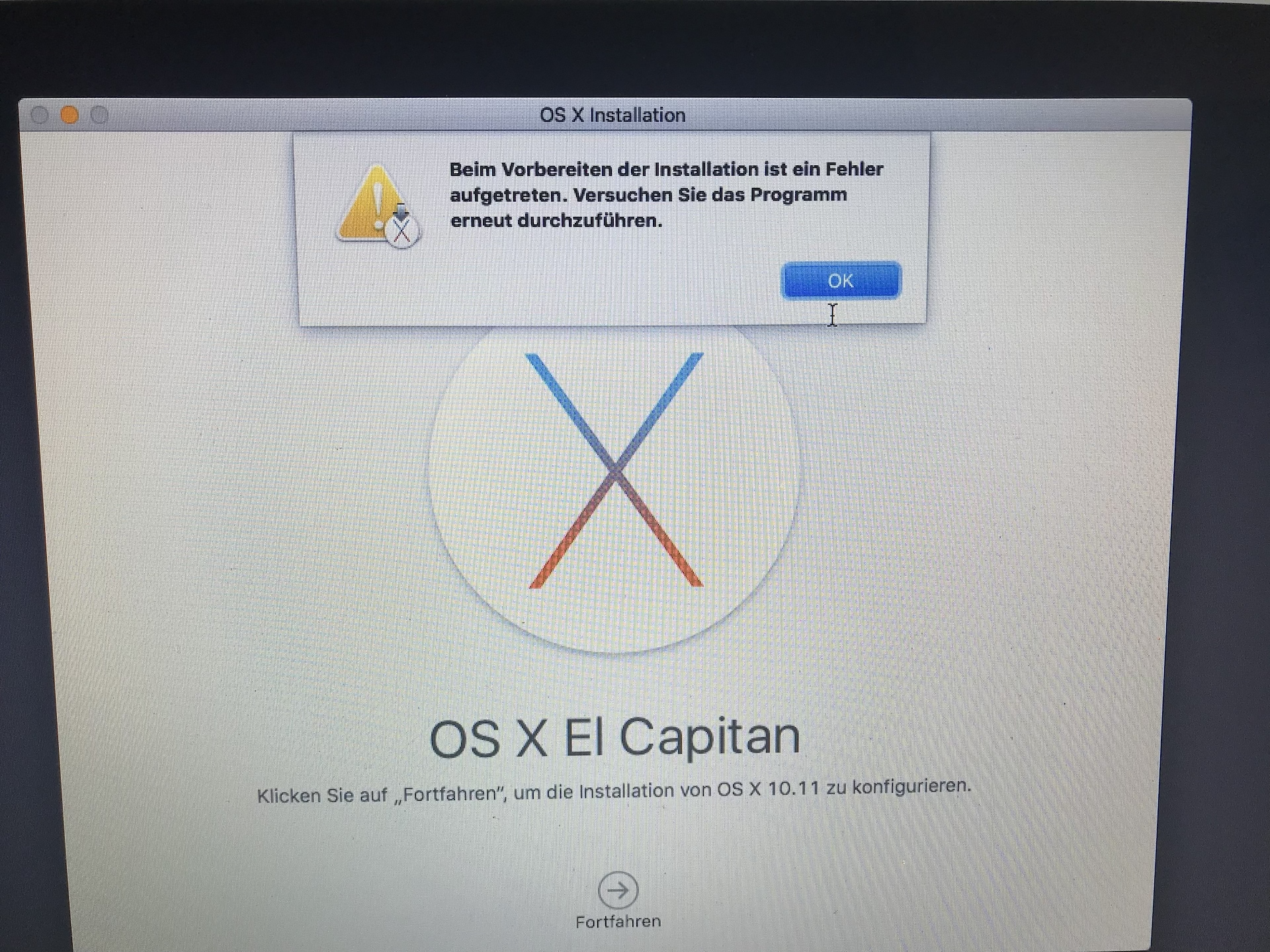 ich konnte mit cmdR auf das OS X Dienstprogramm kommen, habe dort im Terminal date plus Zahlen eingegeben, dann die im Festplattendienstprogramm die Festplatte erneut gelöscht, dann wieder zum OS X Dienstprogramm und "OS X erneut starten" geklickt. und bin dann beim 2 Schritt der Installation ausgebremst worden mit dem Hinweis "beim vorbereiten ist ein Fehler aufgetreten"(Foto von 15.44 Uhr)...ich bin kurz davor aufzugeben