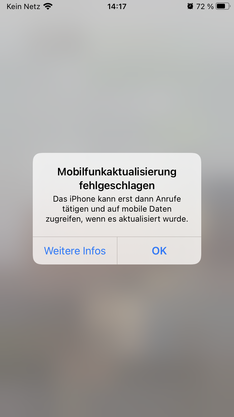 meine Frage ist was ich da tun kann wenn ich nach dem installieren des letzten Software Updates diese Meldung bekommen habe „ Mobilfunk Aktualisierung fehlgeschlagen“ was kann ich tun ich hab schon bisschen nachgeguckt aber da stand nur das ich es reparieren lassen muss oder das ich die Software nochmal installieren muss (mit einem Mac) aber weil ich kein mac hab würde ich gerne wissen wie ich das Problem beheben kann so das ich die Reparatur umgehen kann