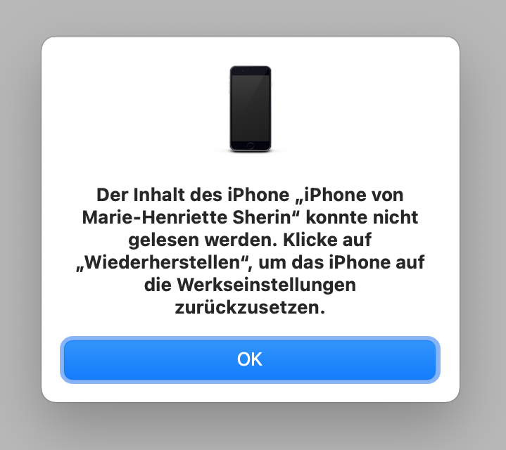 Vor kurzem ging das noch. Jetzt werde ich aufgefordert, auf die Werkseinstellungen zurückzusetzen. Sowohl Mach als auch iPhone sind auf dem neuesten Stand: