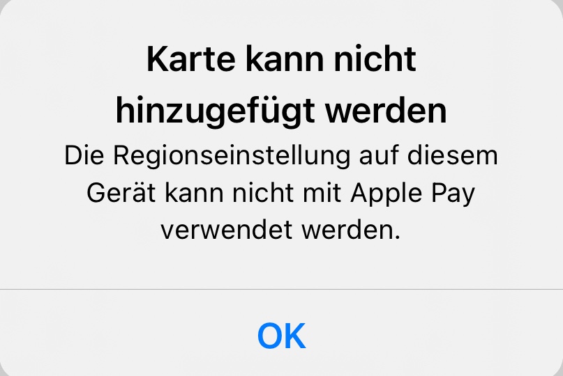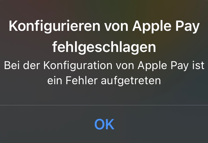 Ich bin teil einer Familienfreigabe, allerdings sollte dann (falls es nicht funktioniert) eigentlich die Meldung kommen "Dieser iCloud Account kann nicht für Apple Pay verwendet werden" Hier bekomme ich bloß die Meldung, dass ein Fehler aufgetreten ist, ich habe auch schon einmal mein iPhone auf Werkseinstellungen zurückgesetzt, keine Besserung. Auch mit iOS 14.7 (von vor ein paar tagen) gibt es keine Besserungen/Änderungen.