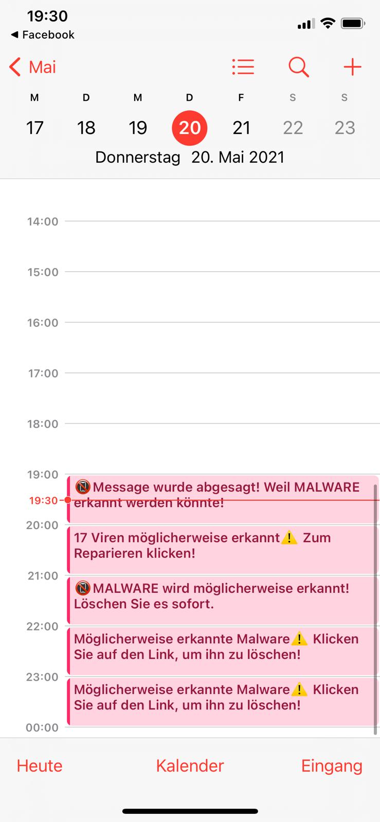 Bei Kalenderviren handelt es sich um gefälschte Meldungen im Kalender, die ihre Opfer dazu auffordern betrügerische Webseiten zu besuchen. Betroffene können sich jedoch durch das Anklicken der Links mit Schadsoftware infizieren oder unbeabsichtigt nutzlose Dienste abonnieren. Die einzige Möglichkeit, den hartnäckigen Kalenderspam loszuwerden, ist also das Löschen dieser Einträge.