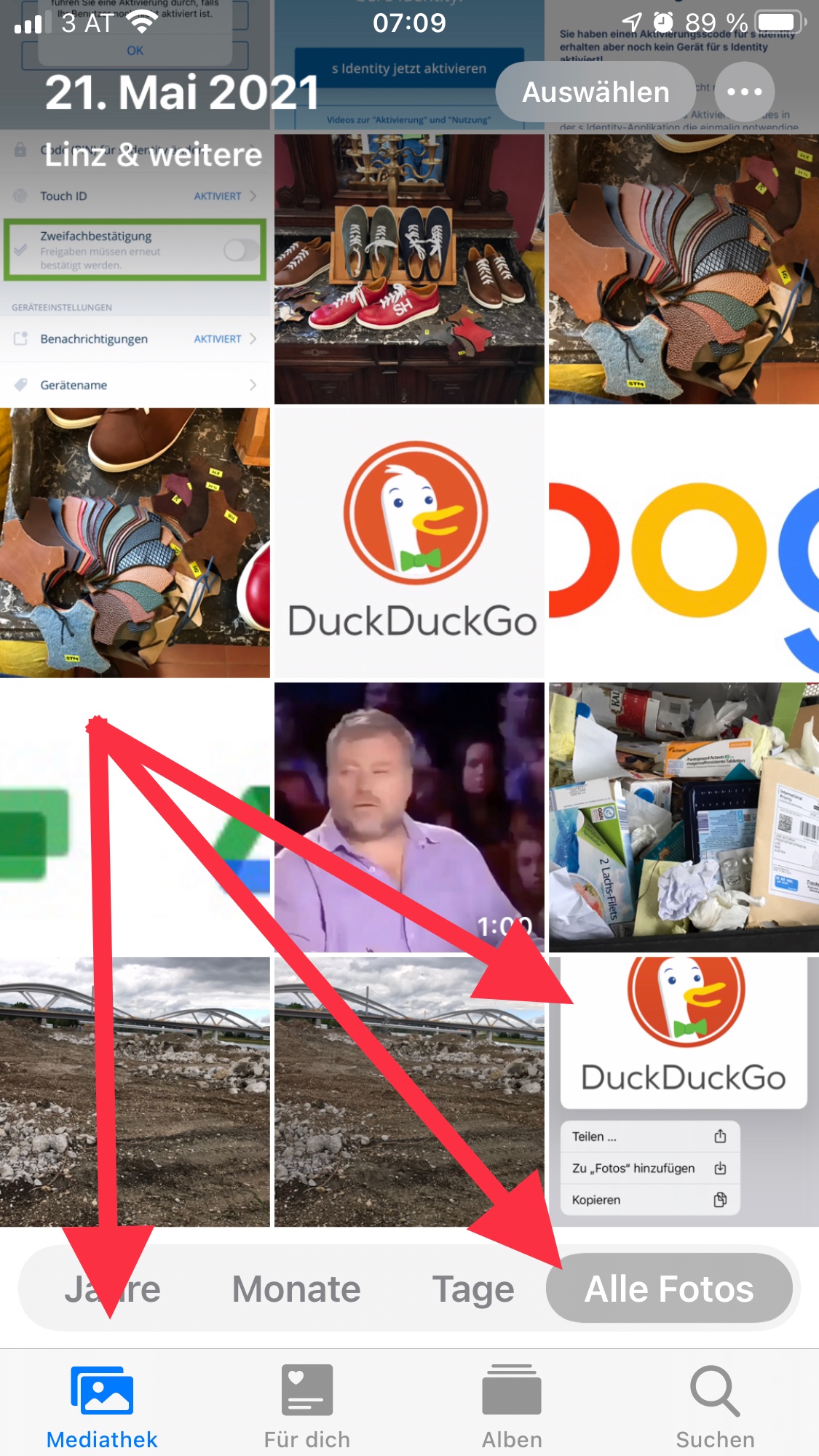 Gehe dann in Fotos auf "Mediathek" und wähle "Alle Fotos" Dort ist es dann: