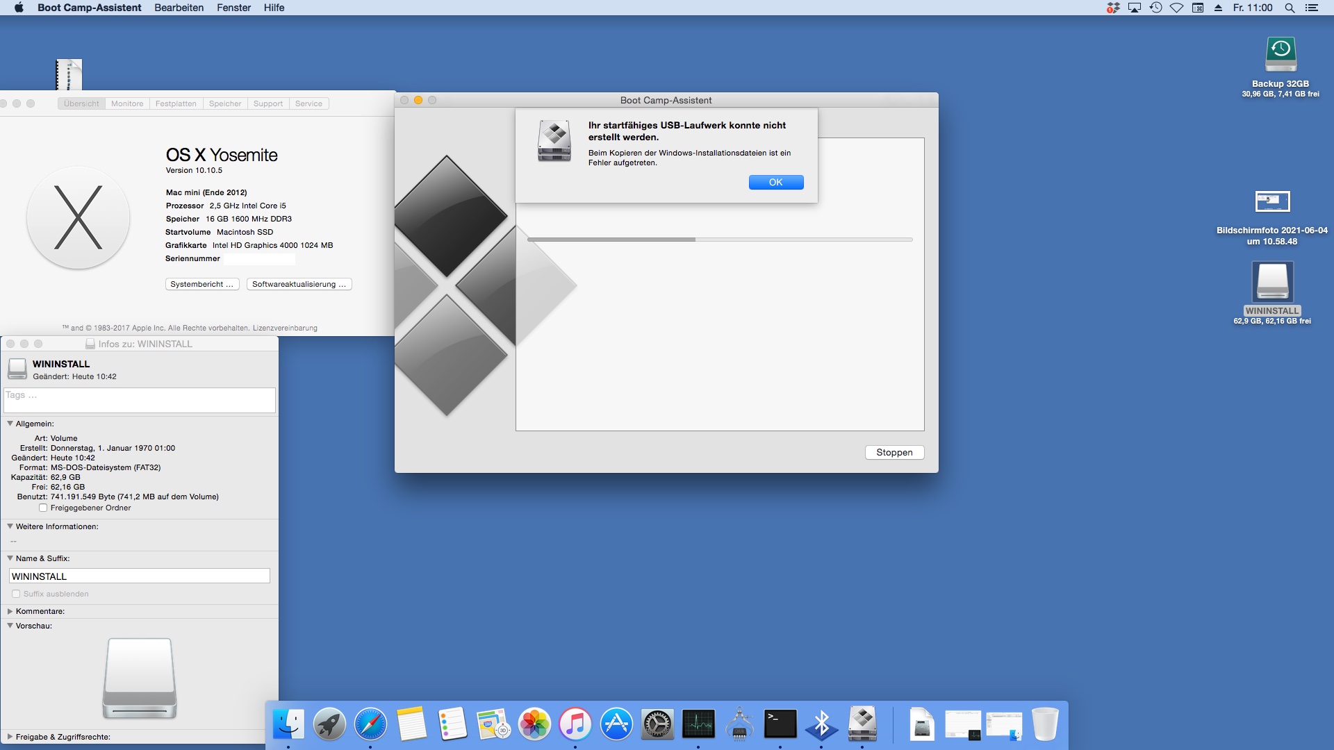 Nach dem Format der USB habe ich versucht mit dem Boot Camp Assistenten das Windows Installationsmedium zu erstellen. Dabei wird das USB Medium neu formatiert und automatisch wieder WININSTALL genannt. Auch dieser Versuch schlug fehlt.