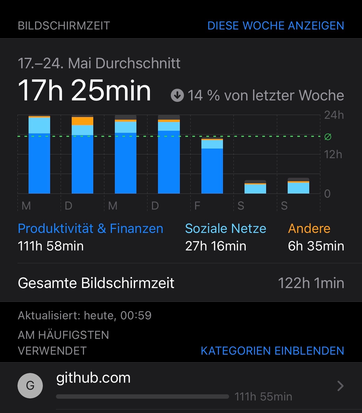 ich habe gerade mal meine Bildschirmzeit in den Einstellungen angeschaut. Hierbei sind mir zwei Wochen aufgefallen, in denen ich angeblich auf der Webseite „github.com“ aktiv gewesen sein soll. Ich kannte bis zum jetzigen Zeitpunkt diese Seite nicht.