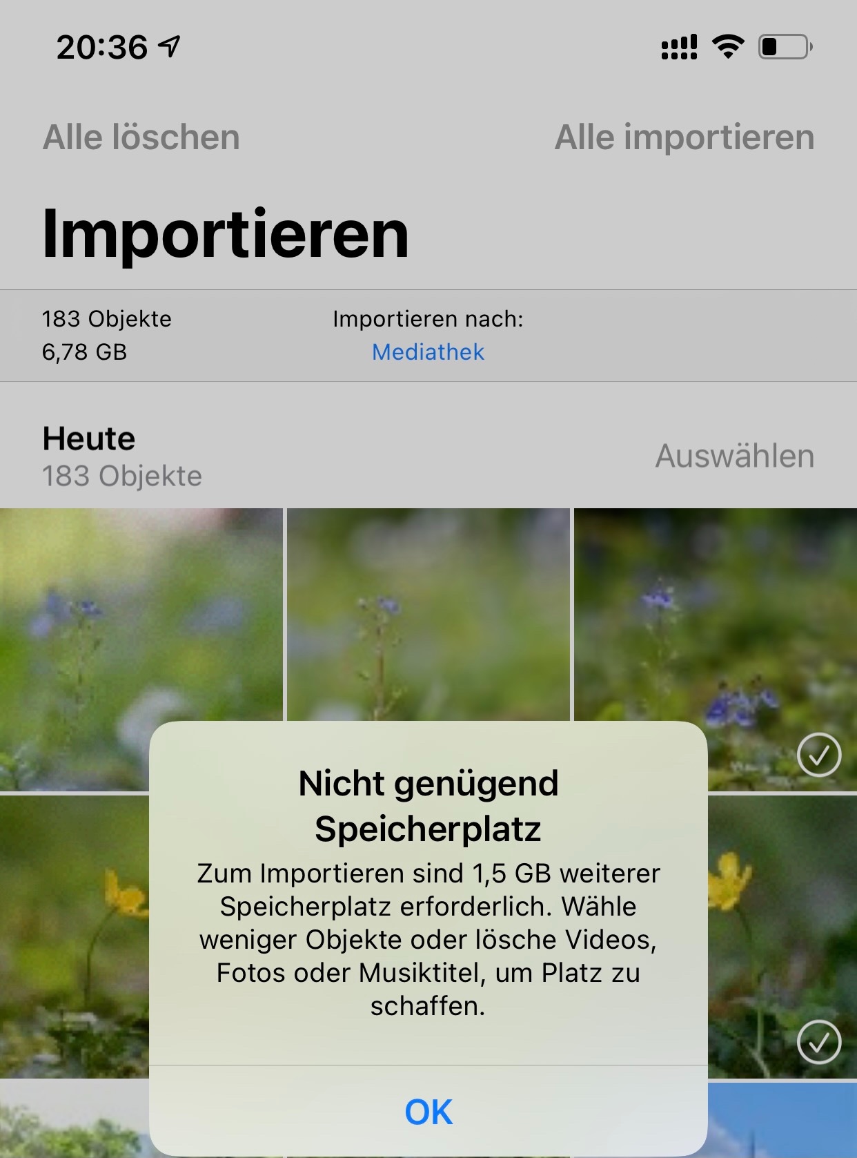 Bilder, die ich mit meiner Nikon-Kamera schieße, übertrage ich mittels des Lightning to SD Card Camera Readers von Apple auf das iPhone. Dabei kommt es immer wieder vor, dass der Import nicht funktioniert, angeblich weil nicht genügend Speicherplatz zur Verfügung stehen würde.